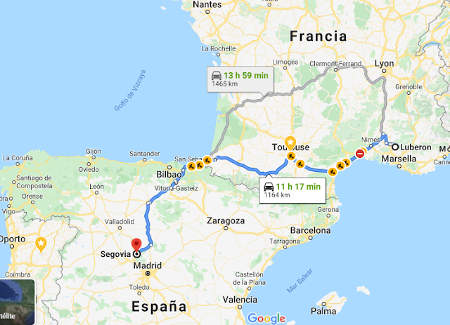 La mejor opción de ruta en cuanto a kilómetros viajando desde Segovia pasando por País Vasco Francés, Midy Pirenee, Occitania, Languedoc, es decir el sur sur de Francia, implica un recorrido de 1165 km si se hace del tirón.