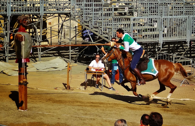 Tuvimos la ligera suerte de pasar por allí cuando algunos jinetes preparaban la liza atacando una estatua giratoria a la que tiene que golpear y evitar a su vez que en el giro unas bolas que lleva colgadas en su mano derecha les golpeen.
