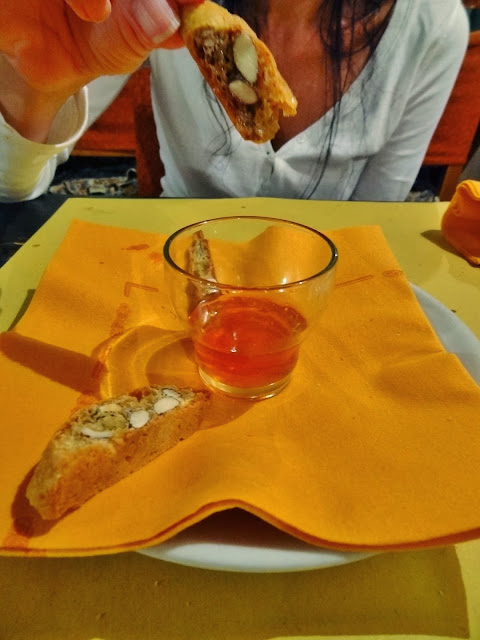 Cenamos con una muy buena relación de calidad precio , bruschettas de tomate y unos platos de pasta gruesa con ricota y trufa unos, otros con ajo y tomate picante. Rematando con unos Cantuccini para mojar en un licor local
