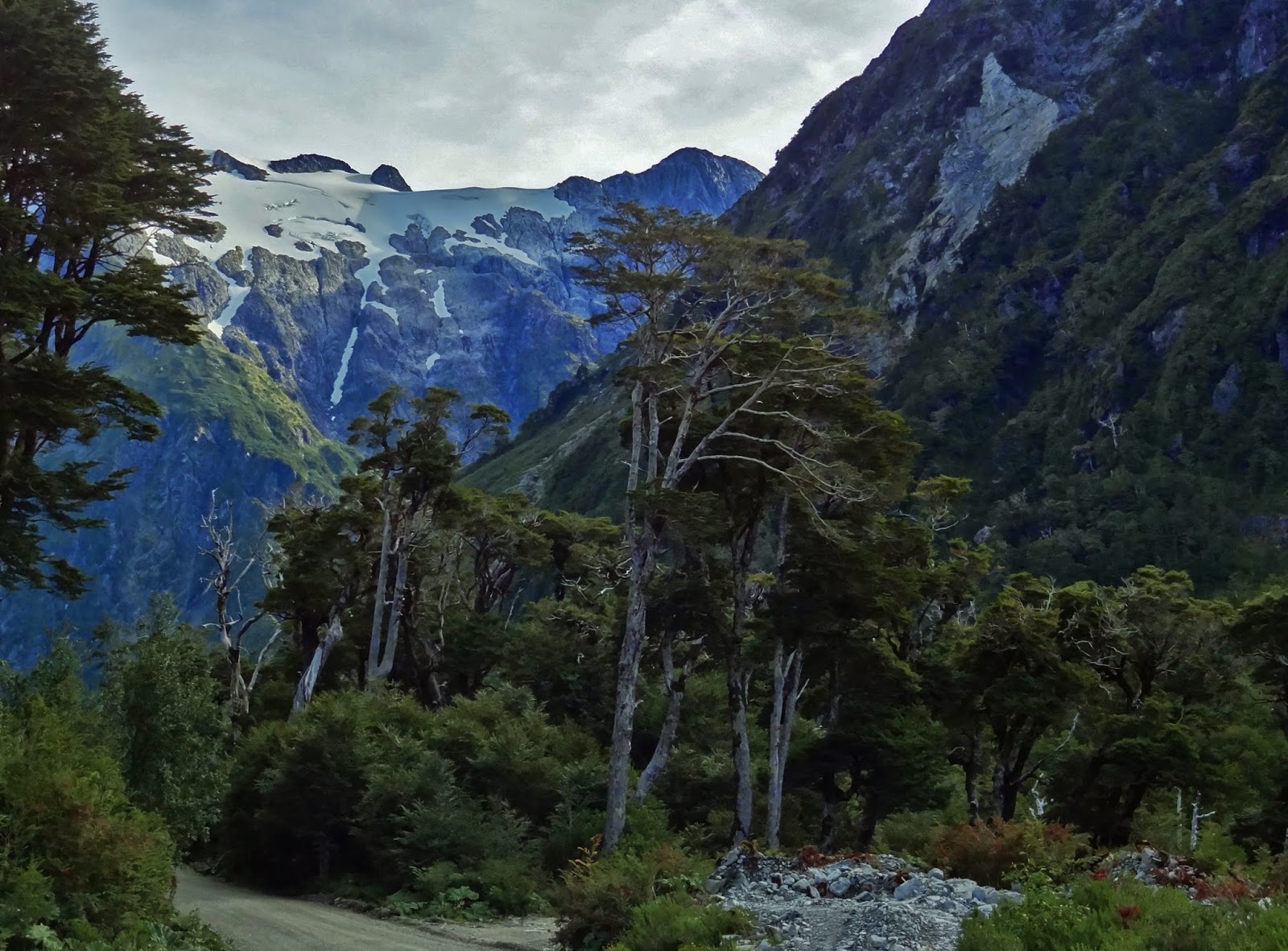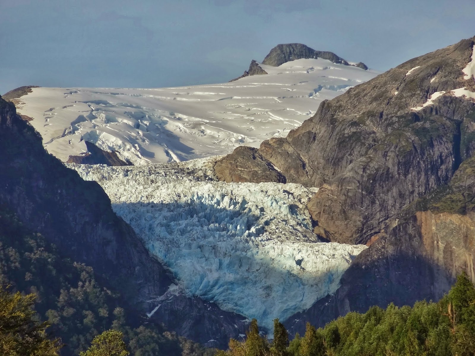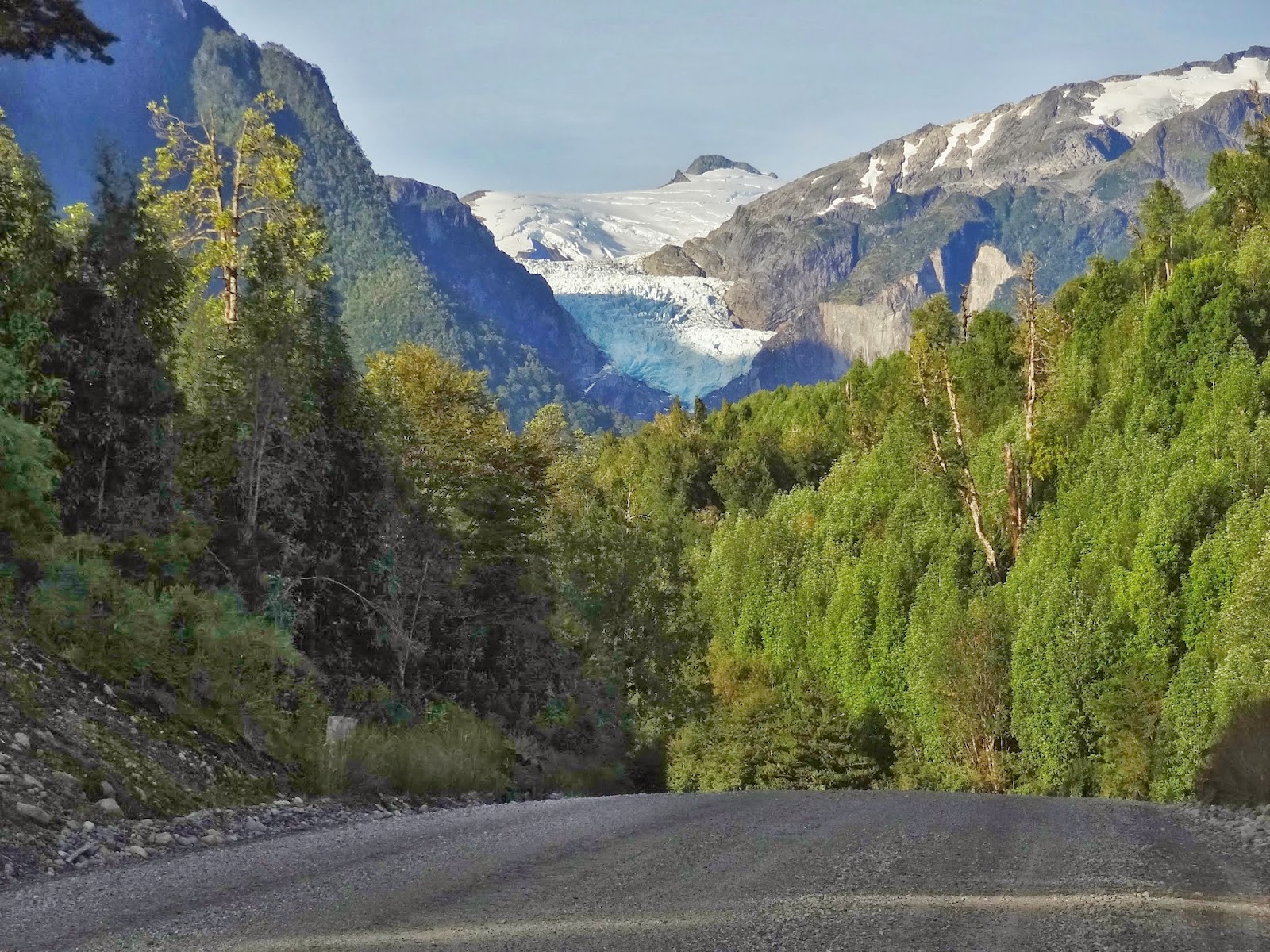 El paso por el parque hasta Puyuhuapi se hace por una estrecha pista de ripio con muchas curvas y contra curvas. Nos pareció maravilloso y de nuevo el asombro ante la belleza del entorno hizo que ni notásemos los kilómetros acumulados. En este recorrido estuvimos muy cerca de glaciares o ventisqueros de montaña, tramo que que fue también uno de los más bellos de todo el viaje.