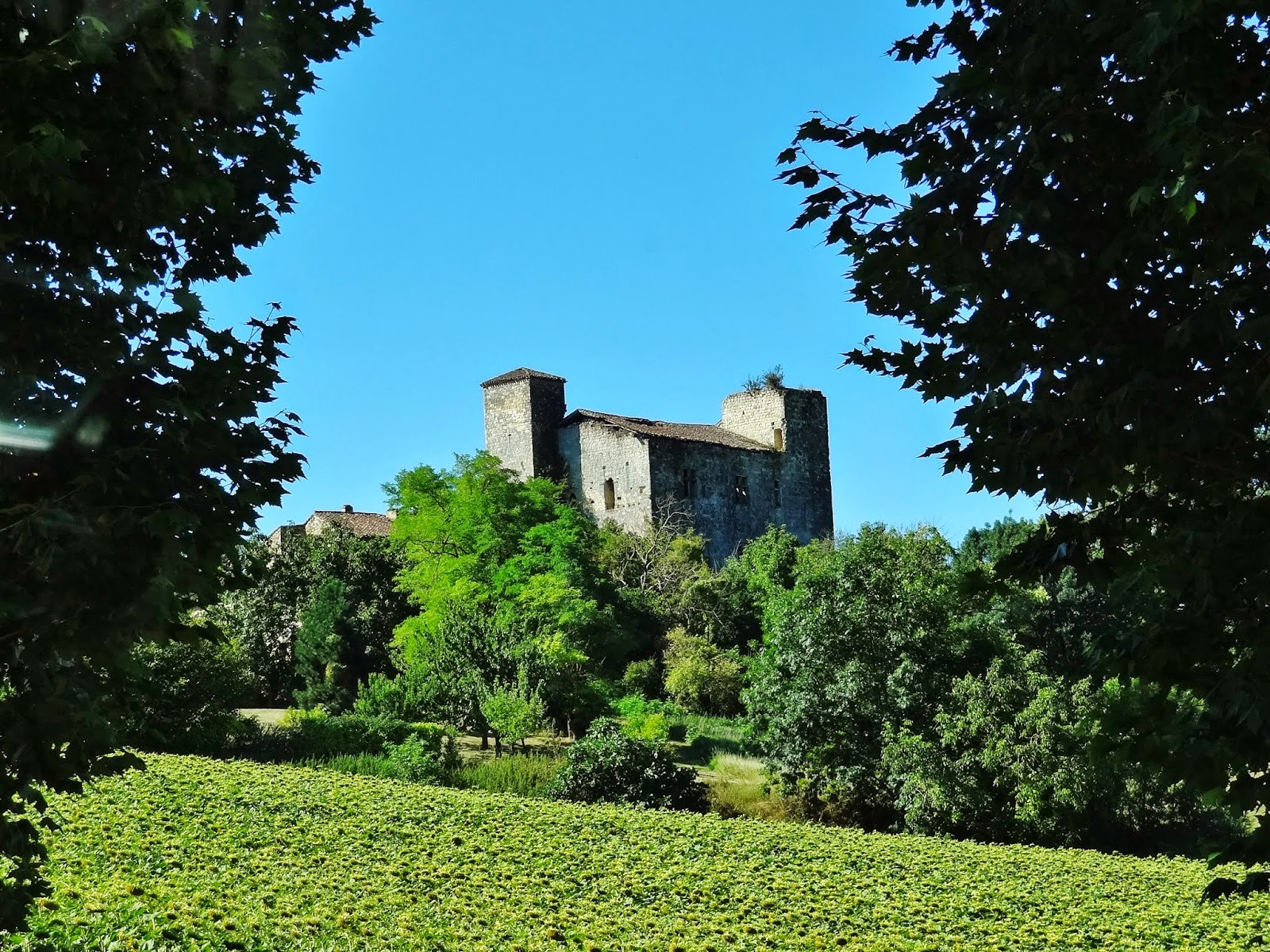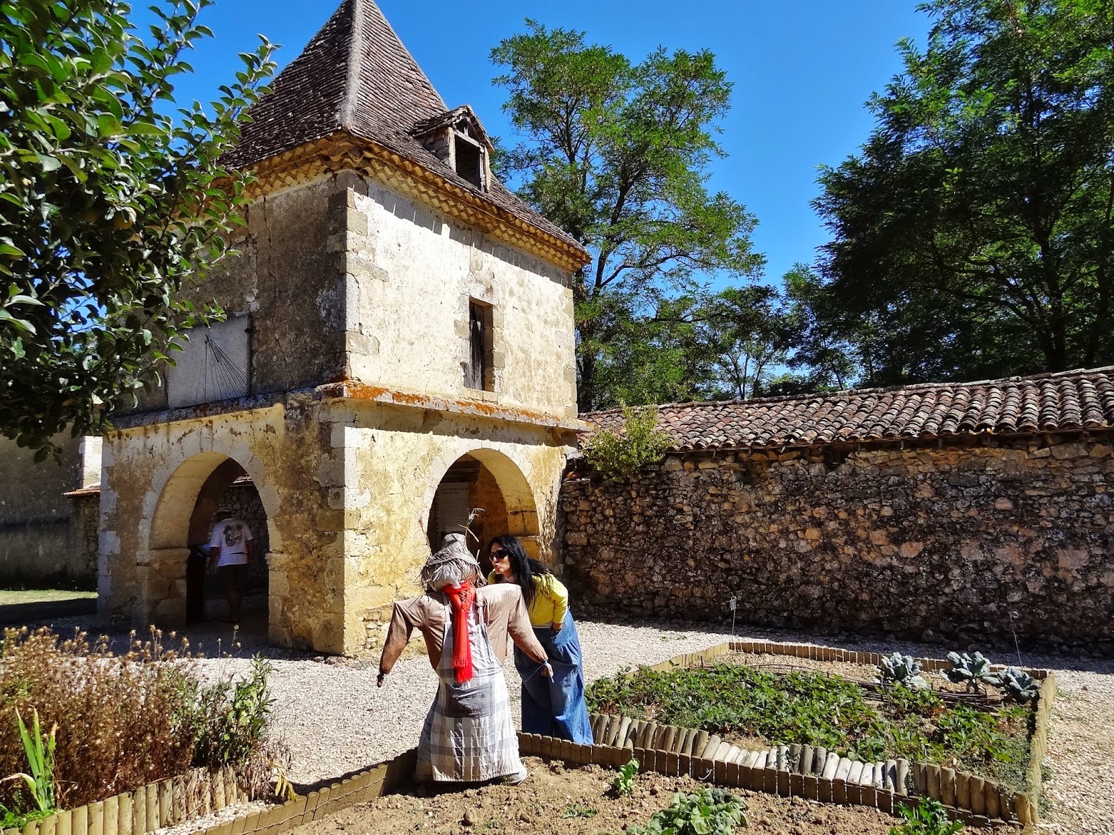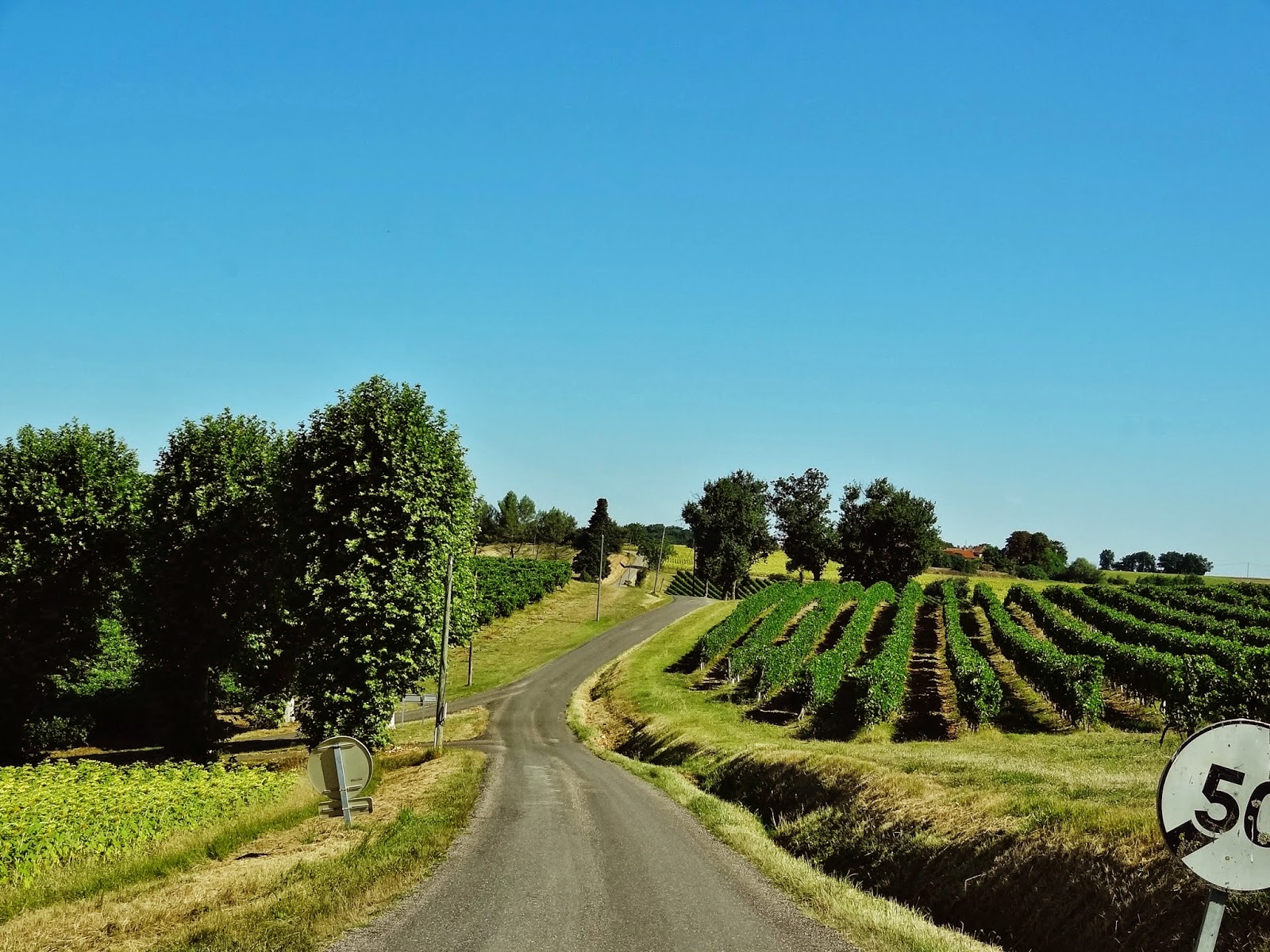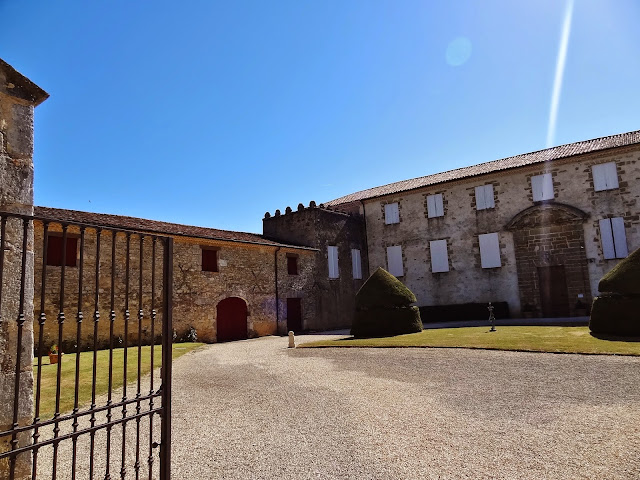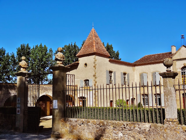 Y muy cerca el Castillo de Busca Maniban, que dicen es uno de los mejores ejemplos de la arquitectura del siglo XVII en Gascuña, rodeado de viñedos necesarios para la producción del famoso Armagnac desde hace siglos y hasta los tiempos presentes. Campos cuidados y especialmente las viñas en las que marcaban los líneos con rosas.