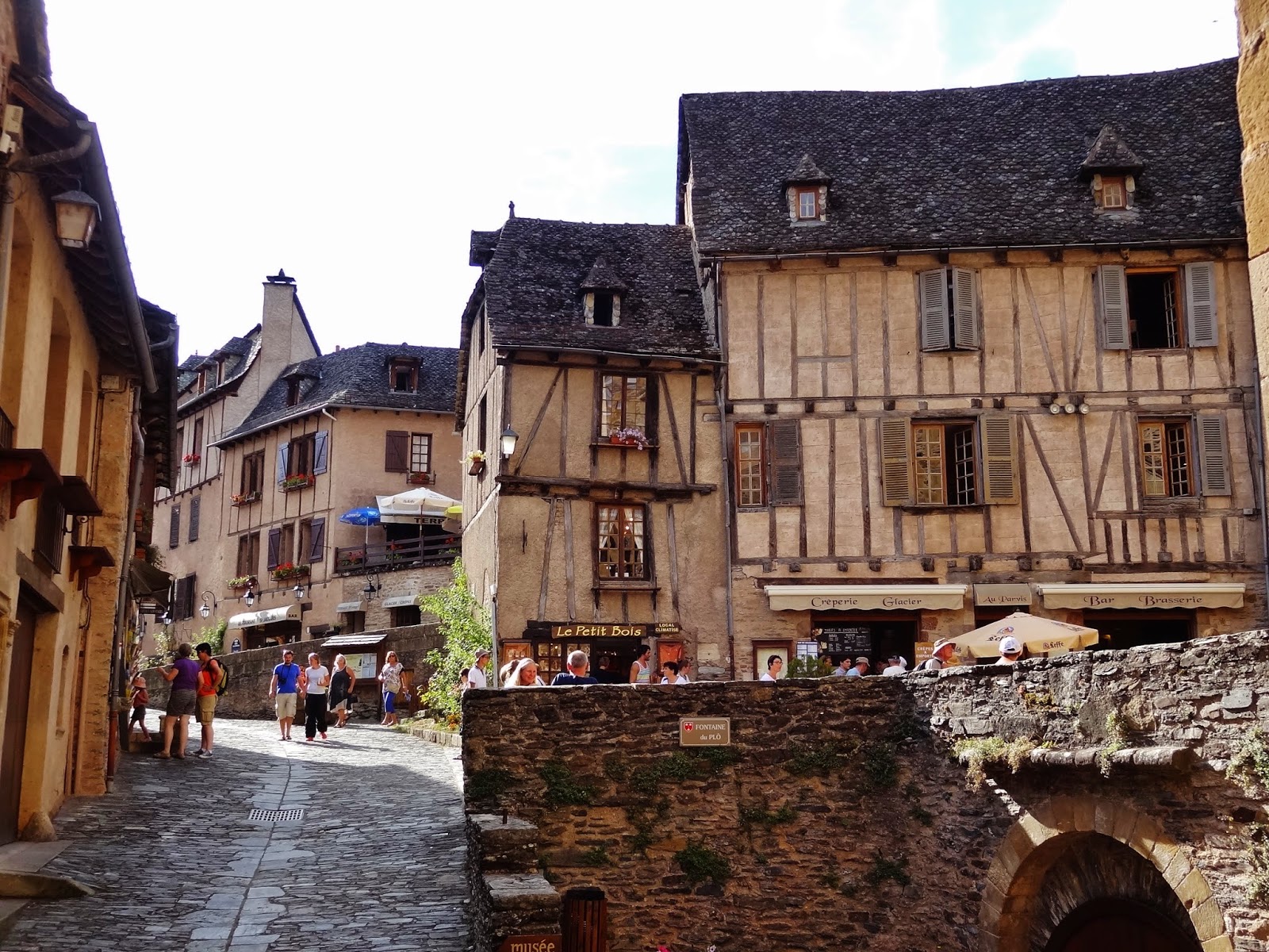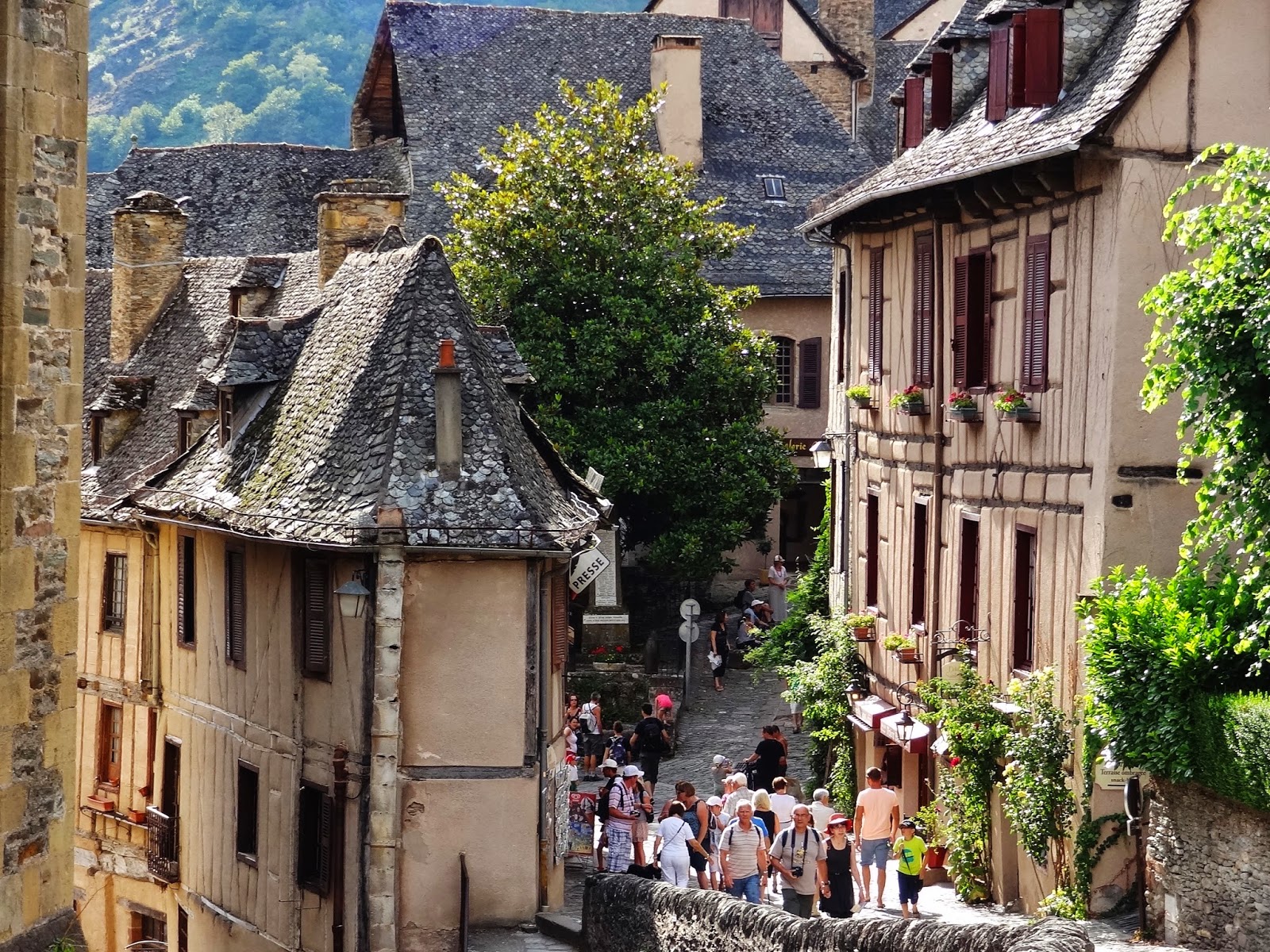 Gracias a las reliquias de Sainte Foy que se trajeron en el año 866, Conques se convirtió en un centro de peregrinación y un gran hito en el camino de Santiago. El pueblo gira en torno a su abadía, construida en el siglo X, pero también nos regala fachadas en numerosas casas de entramado de madera y cubierta de pizarra, que ganan en belleza al estar situadas en diferentes planos y alturas debido a la orografía del terreno sito en la ladera de la montaña.