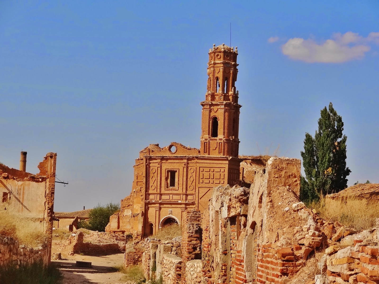 El pueblo , dicen que una joya de la arquitectura mudéjar con varias importantes iglesias y conventos, quedó destruido y en ruinas. Por motivos políticos nunca se volvió a reconstruir, ya que en su lugar se construyó el Belchite Nuevo.