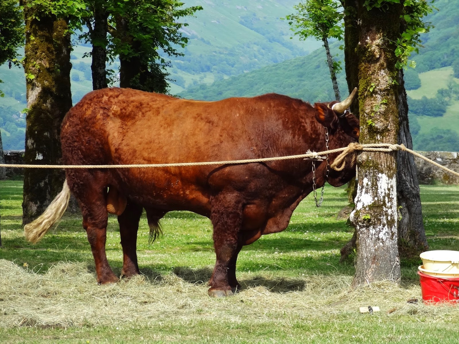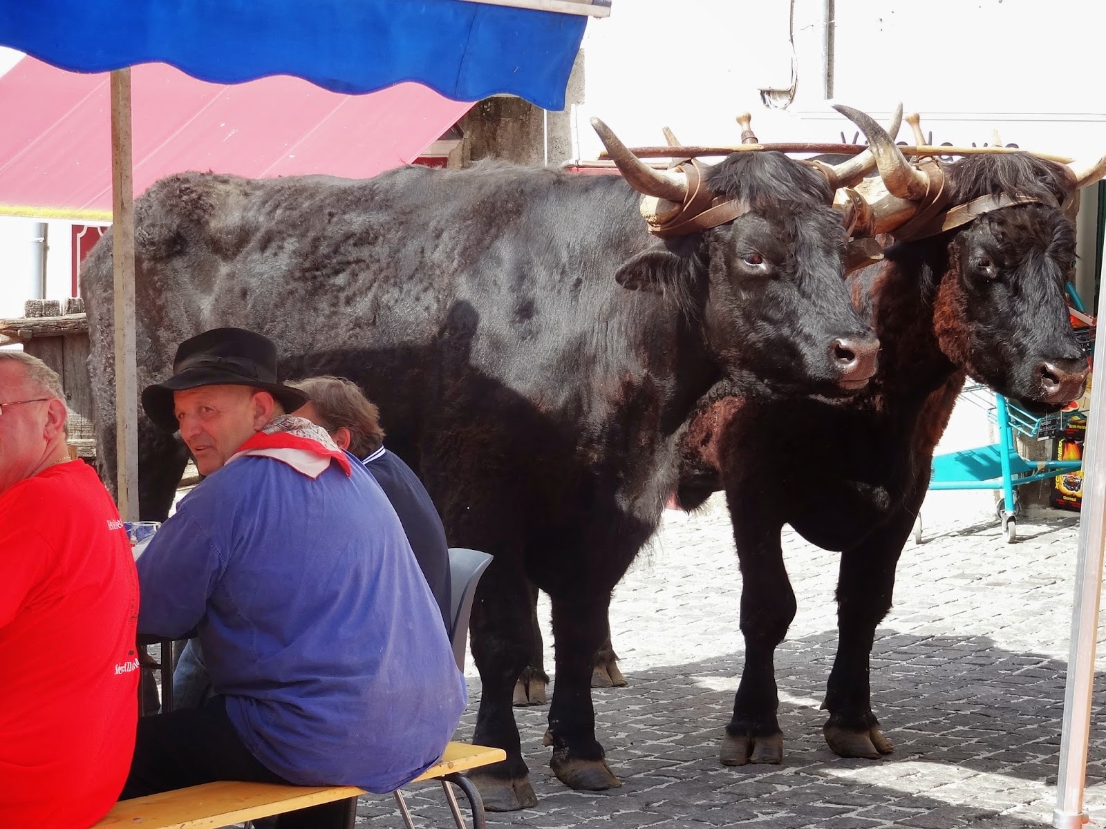 El pueblo se encontraba en fiestas y pudimos ver alguna que otra imagen típica de la máxima representante de la zona, la vaca de raza Salers que estaban expuestas, unas en una especie de feria de ganado y otros bueyes al lado de un puesto de venta de carne autóctona.
