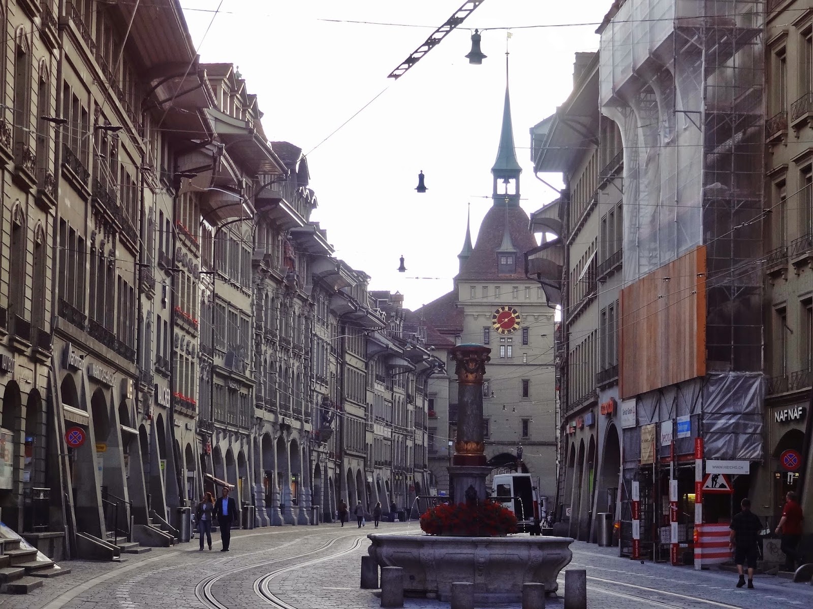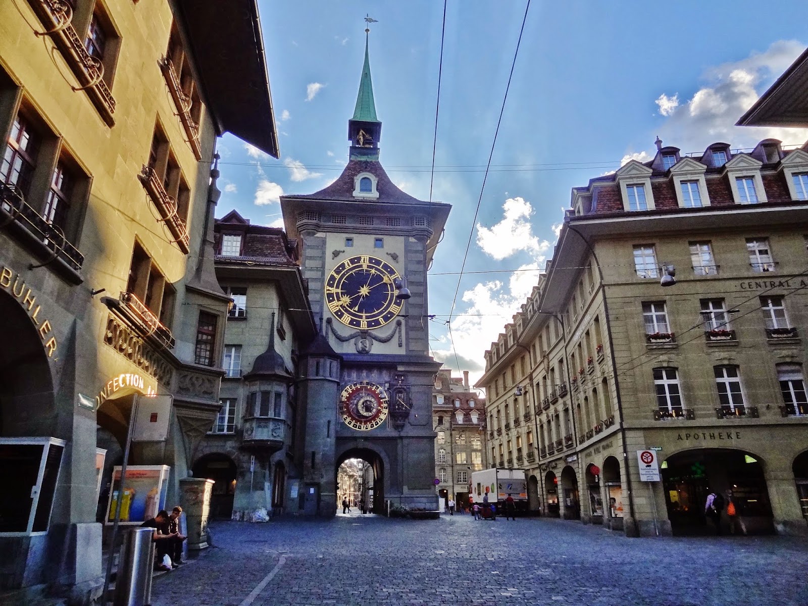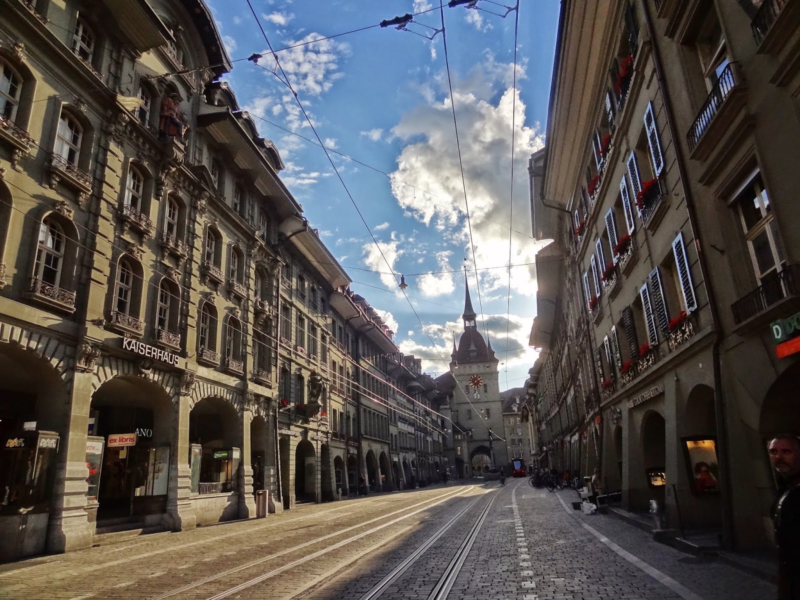 Empezamos por la parte superior de la ciudad vieja habiendo dejado el coche aparcado cerca del casino, y dirigiéndonos hasta la Calle Marktgasse que une dos de las torres más emblemáticas de la ciudad, la Torre del Reloj ( año 1256 ) primera en la historia de las puertas de entrada a Berna y la Torre de la Prisión, considerada la segunda puerta de entrada (año 1647).