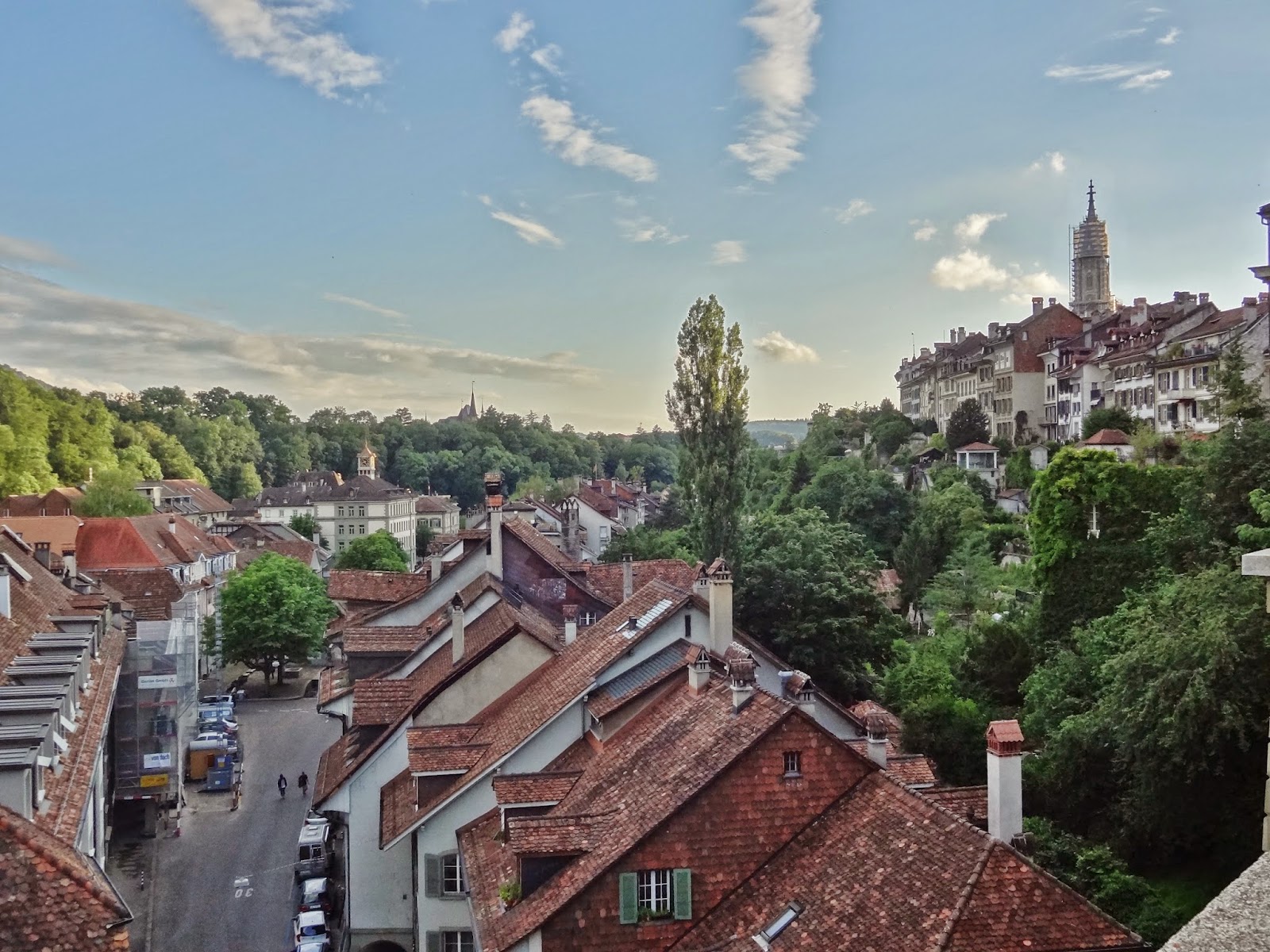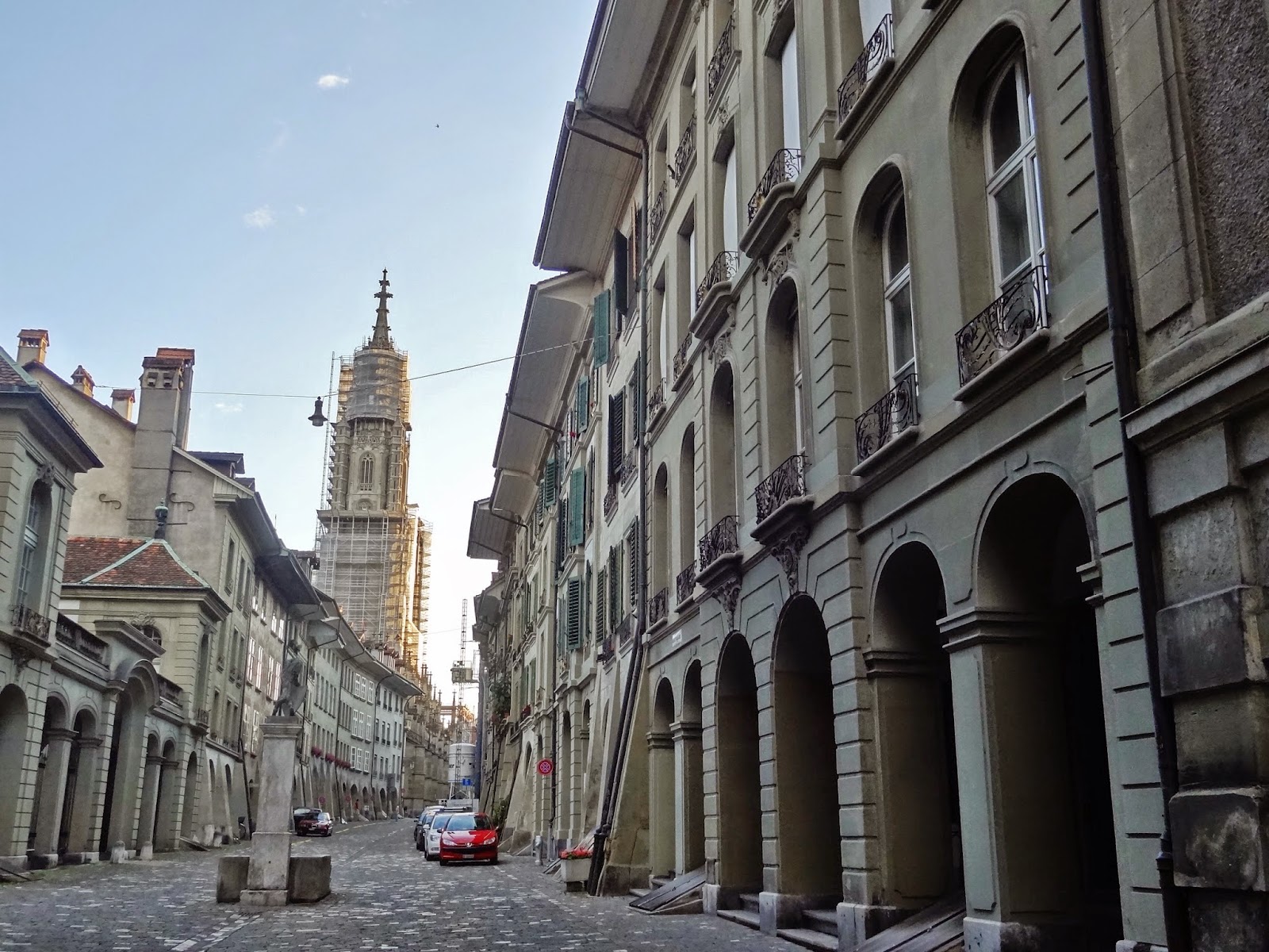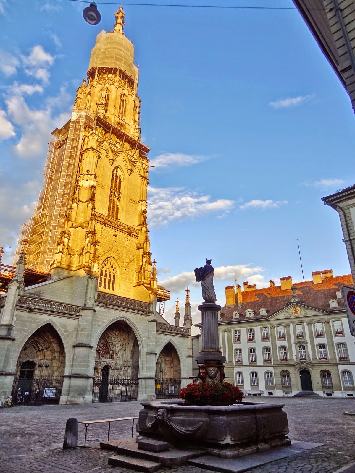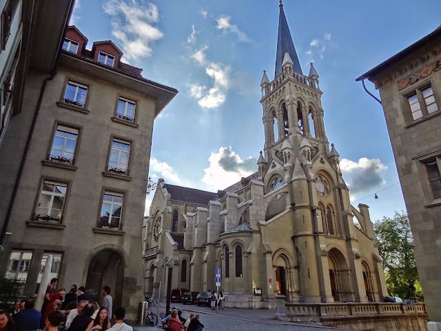 Dimos vuelta sobre nuestros pasos , pero en lugar de volver por Kramgasse lo hicimos por Junkerngasse, para llegar a la zona de la Catedral, Münster con su enorme torre, jardines y vistas sobre el río Aare.