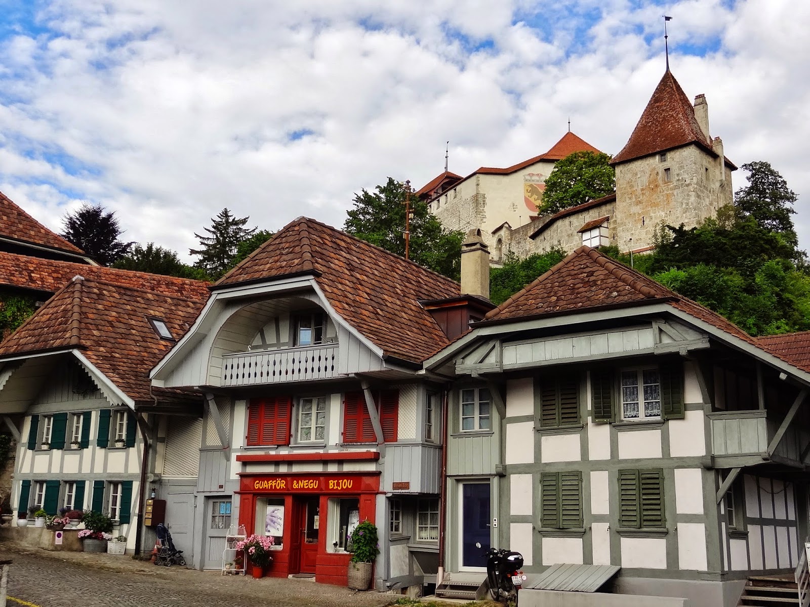 También nos gustó mucho, para no desentonar con el resto de los pueblos que habíamos visto durante el día. Tiene un castillo en una colina que se eleva allí donde confluyen dos ríos, el Sense y el Seane.