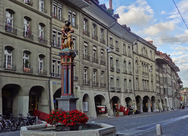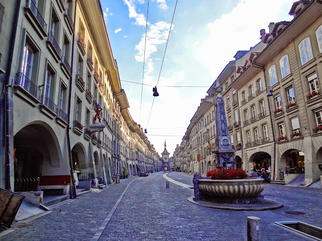 Desde allí, vuelta a la Torre del Reloj, pero en este caso del lado de la calle Kramgasse, absolutamente una preciosidad y que nos dejo alucinando, tanto por la uniformidad y especial aspecto que da la piedra arenisca como por los soportales y por las bellas fuentes medievales que adornan el recorrido. En esta calle vivió Albert Einstein, cuya casa se puede visitar en horario de 10:00 a17:00. Llegamos fuera de hora.