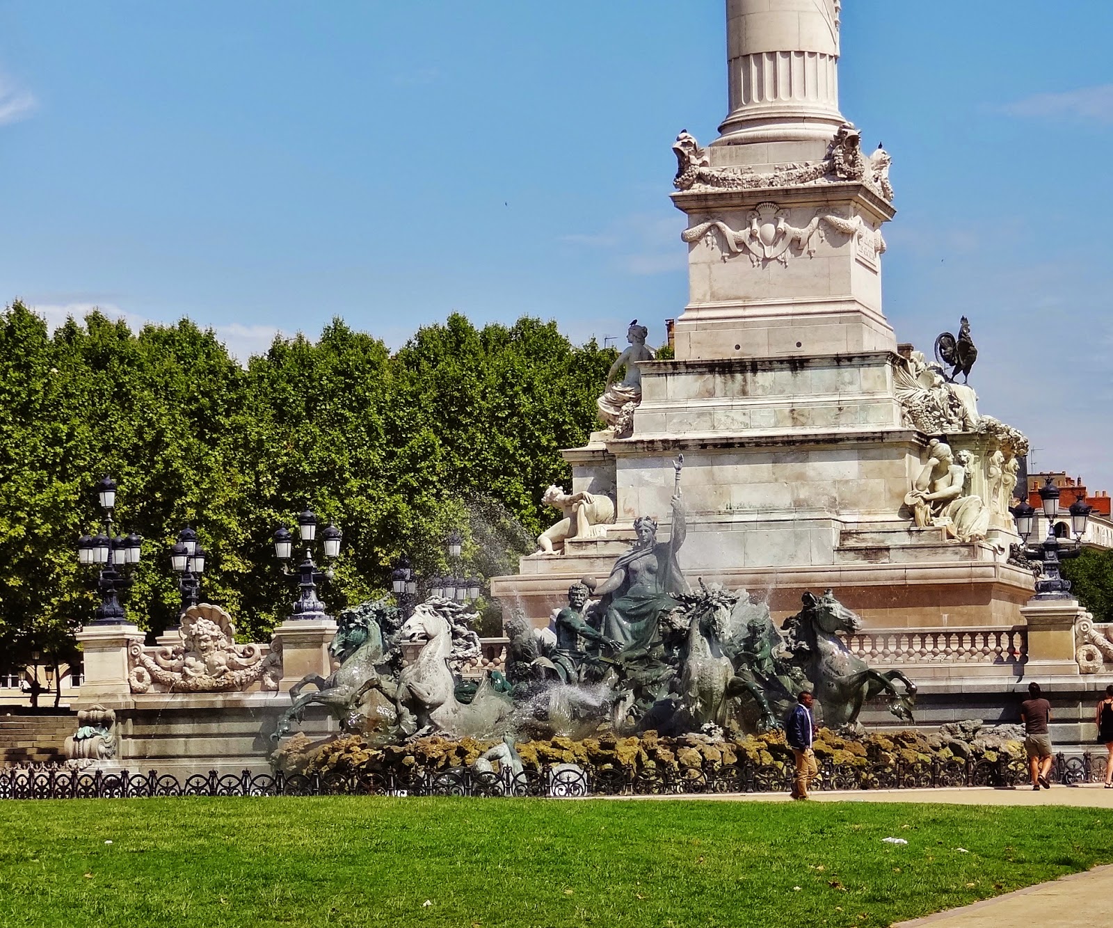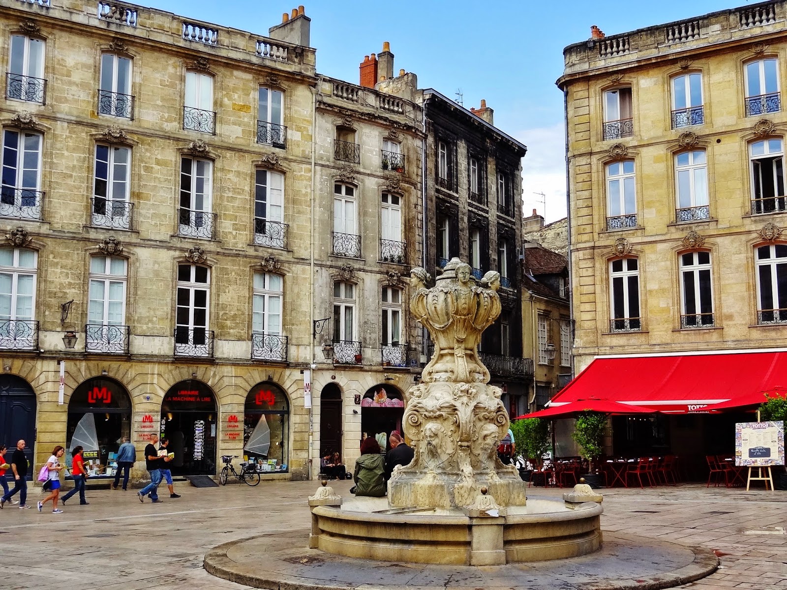Cruzamos a la Plaza para tirar unas fotos y caminando nos fuimos hasta la oficina de turismo, situada cerca del Grand Theatre de Bordeaux, pasando antes por hermosas calles y la conocida Plaza del Parlamento que tiene una preciosa fuente neo renacentista del año 1865.