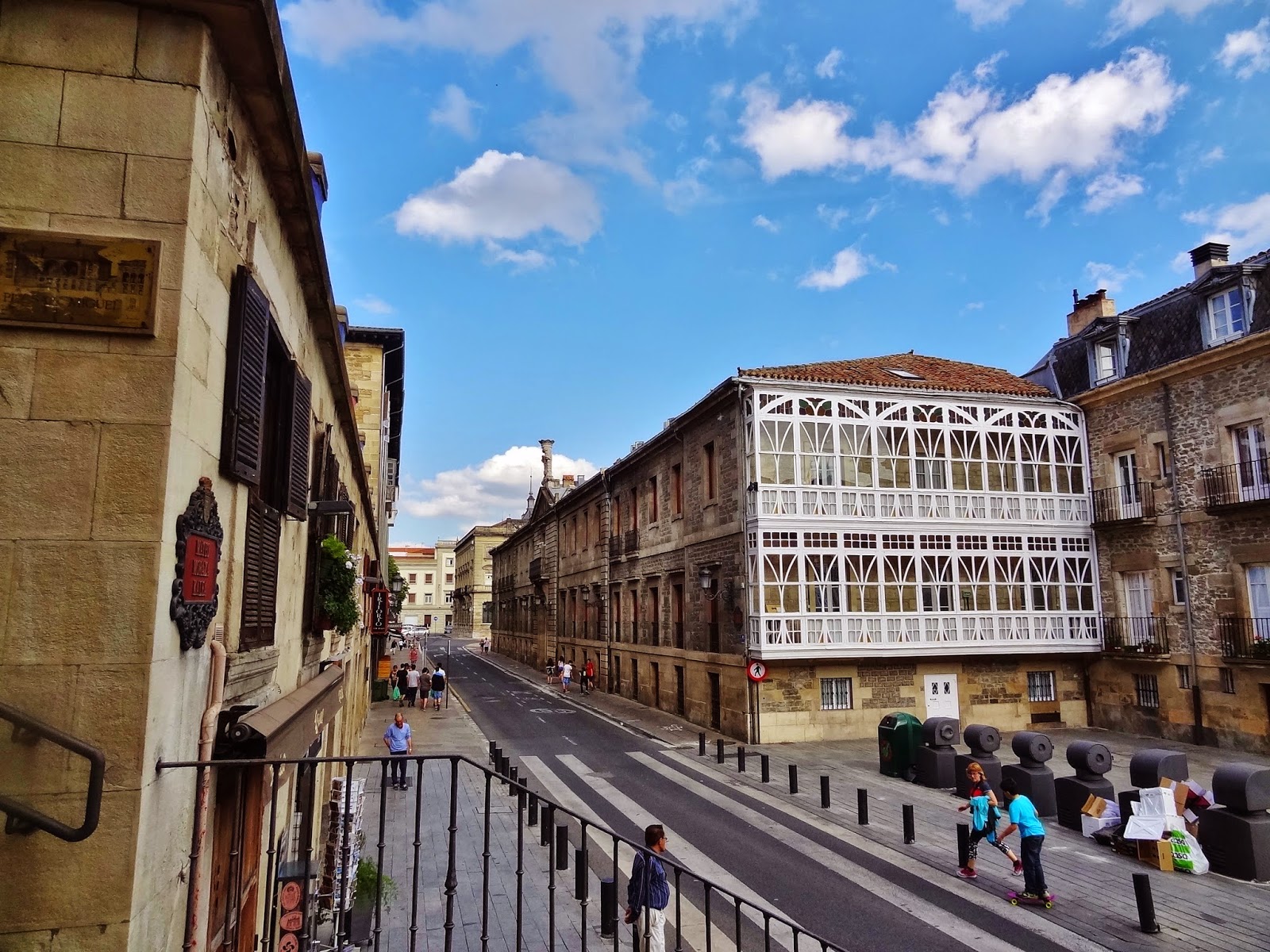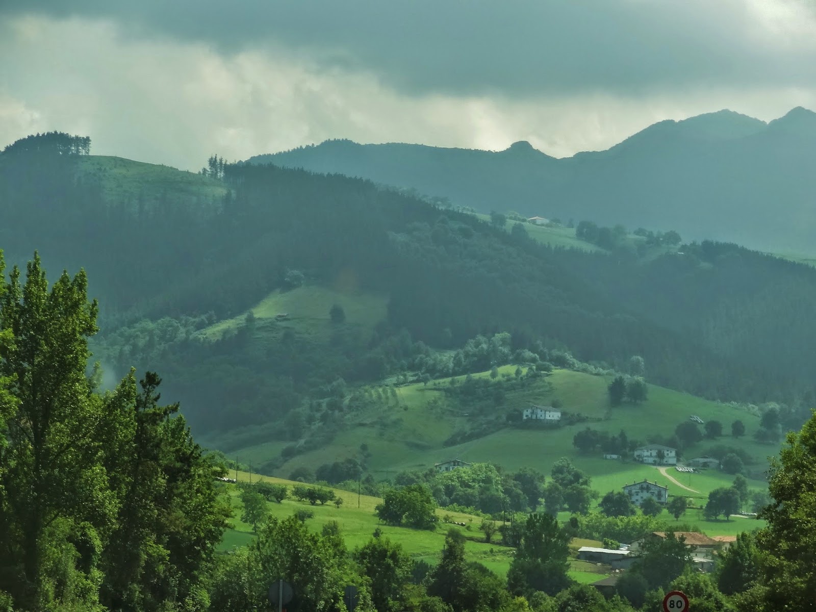 Antes de llegar a la ciudad, nada más cruzar la frontera vasco francesa, nos topamos con esos paisajes típicos del norte español, de verdes y suaves colinas. En el caso del País Vasco salpicados de sus habituales caseríos y construcciones de piedra.