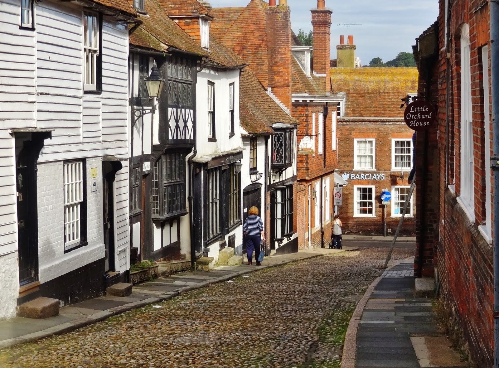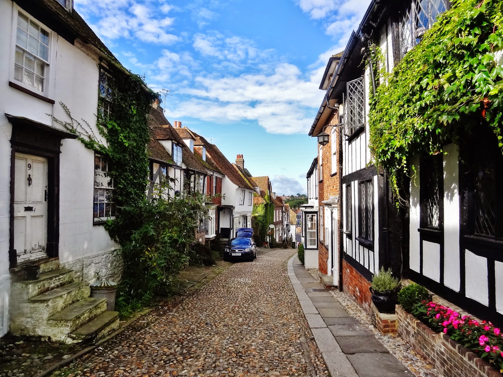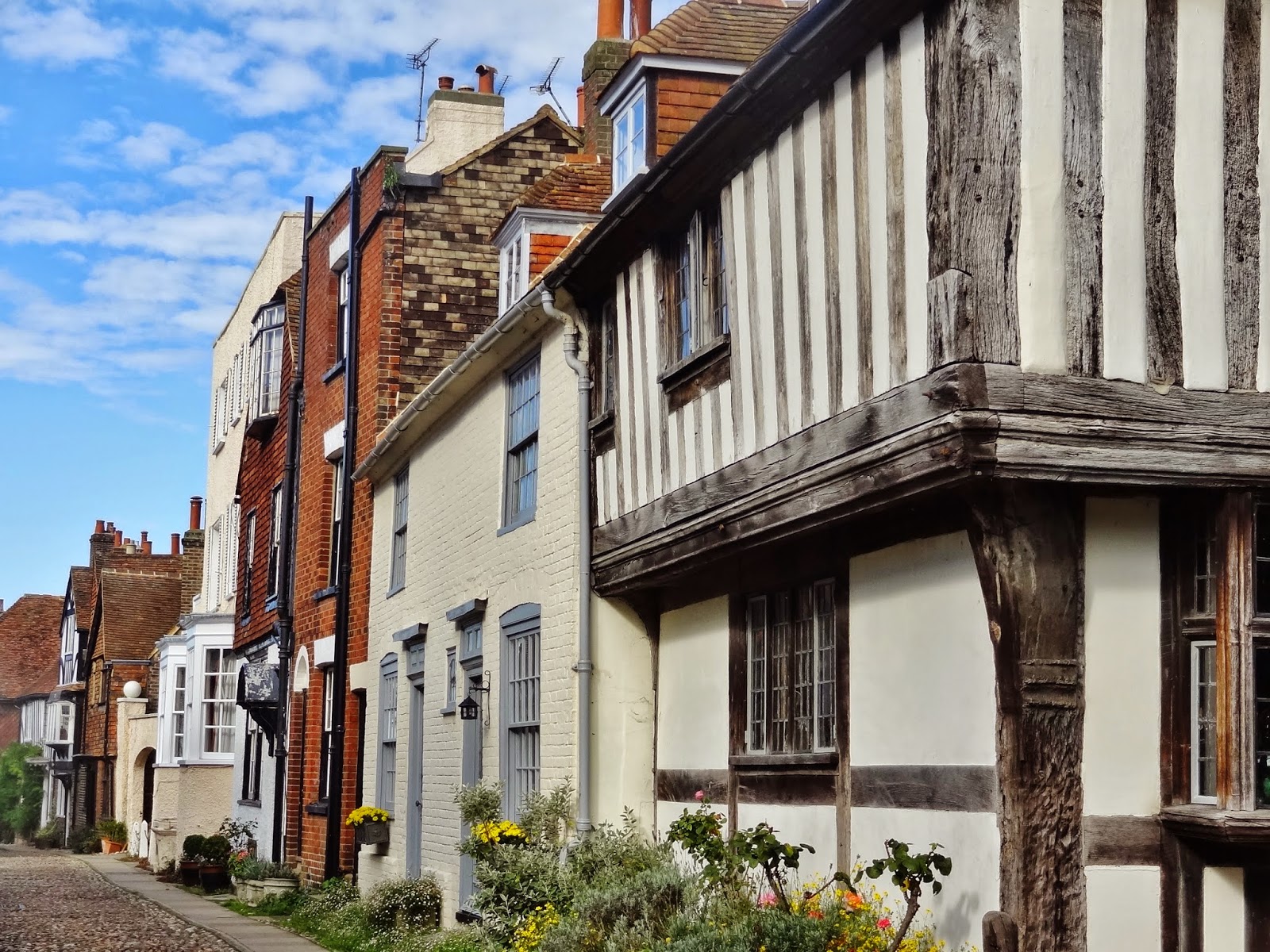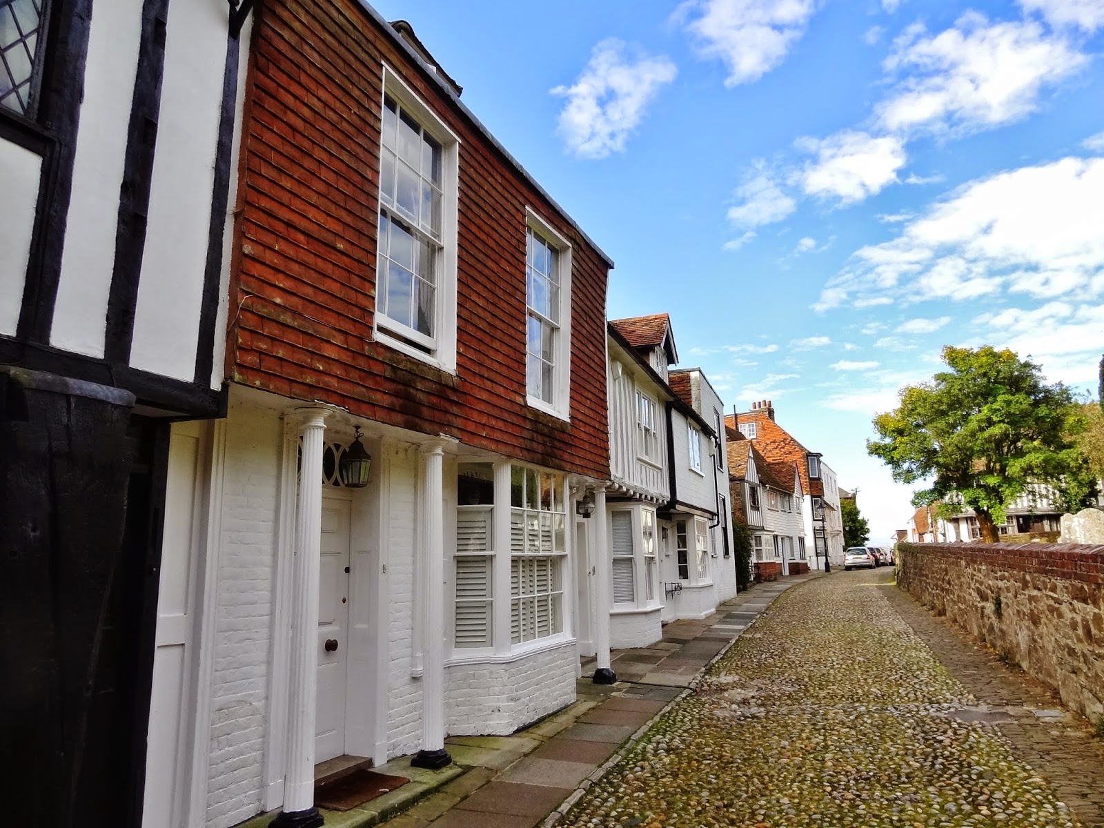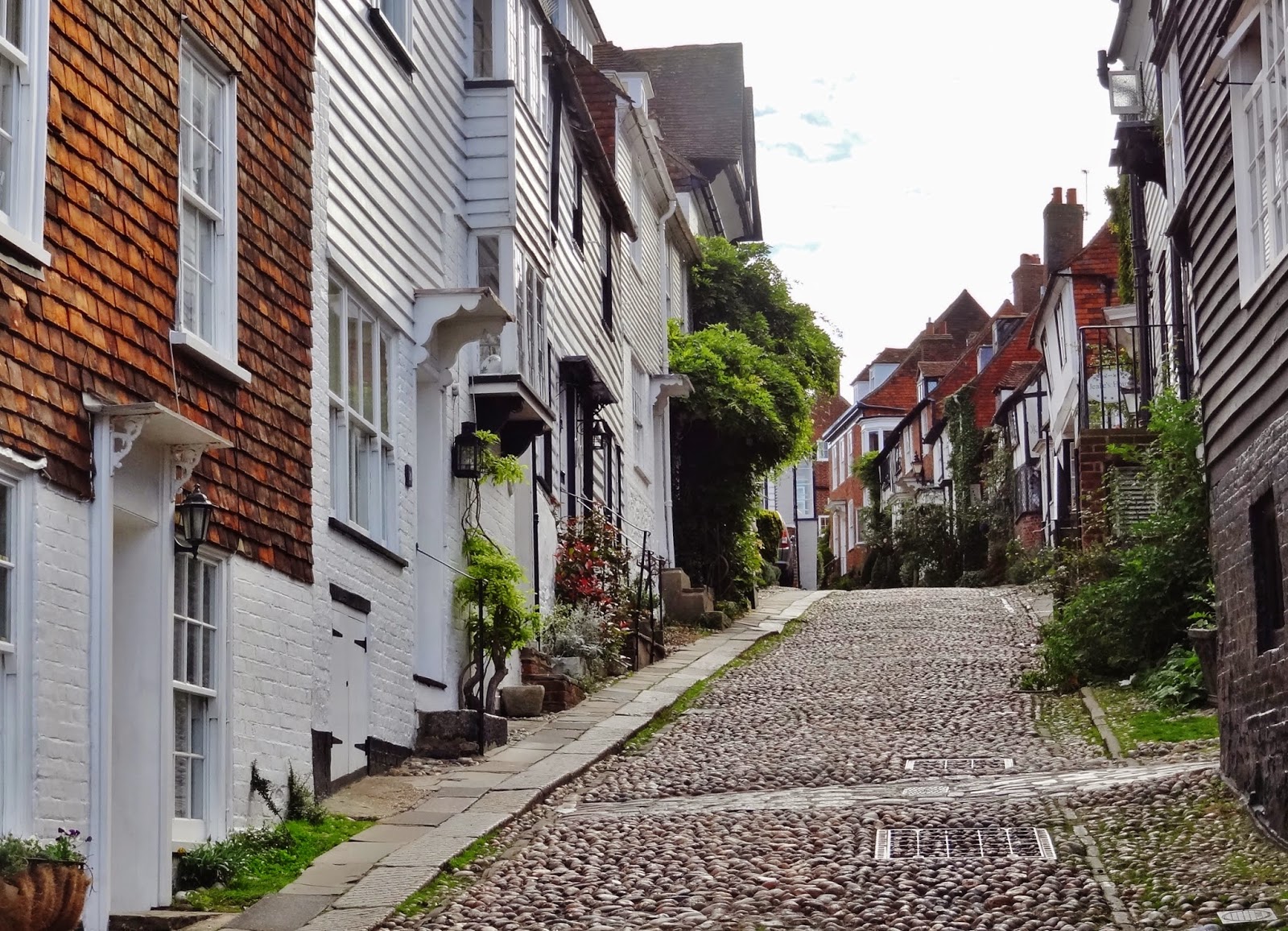 Descendimos hasta la parte baja del casco histórico por la calle empedrada de Watchbell Street hasta llegar a la calle The Mint que conecta con High Street. Solo avanzamos un pelín al principio de esta calle, antes de retroceder sobre nuestros pasos para subir por la calle más conocida y típica de Rye, Mermaid Street.