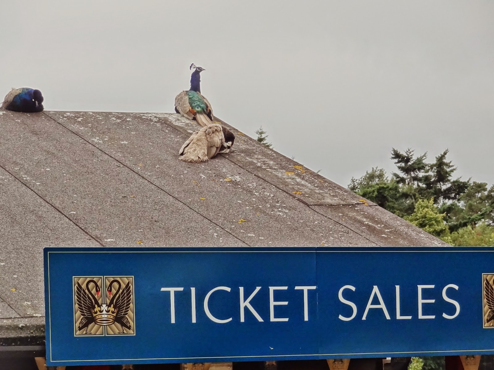 Unos extensos jardines rodean los accesos a este castillo, por lo menos hasta llegar a la zona de venta de entradas, desde donde no se observa nada de este monumento. Teníamos la esperanza de poder ver la silueta del castillo al menos desde la lejanía pero nos resultó imposible. Y de nuevo tomamos la decisión de saltarnos esta visita apremiados por la tarde que se nos iba echando encima, el elevado precio de entrada al castillo con un pago de 19 libras por persona sumado a que lo que vimos en postales e información del castillo no nos motivó de forma suficiente. Nos debimos conformar con la visión de varios pavos reales que descansaban plácidamente sobre los tejados de las cabañas en las que se vendían los tickets de entrada.