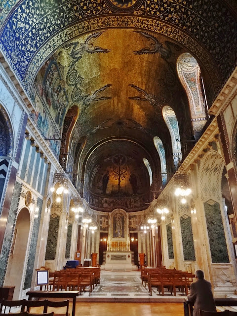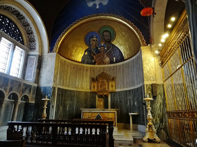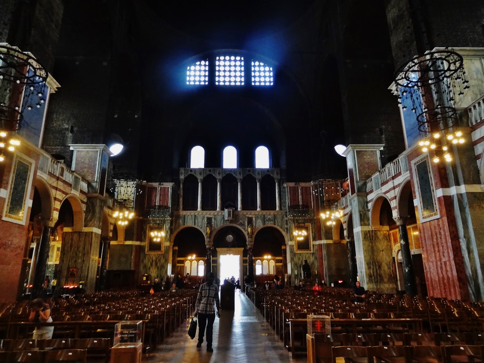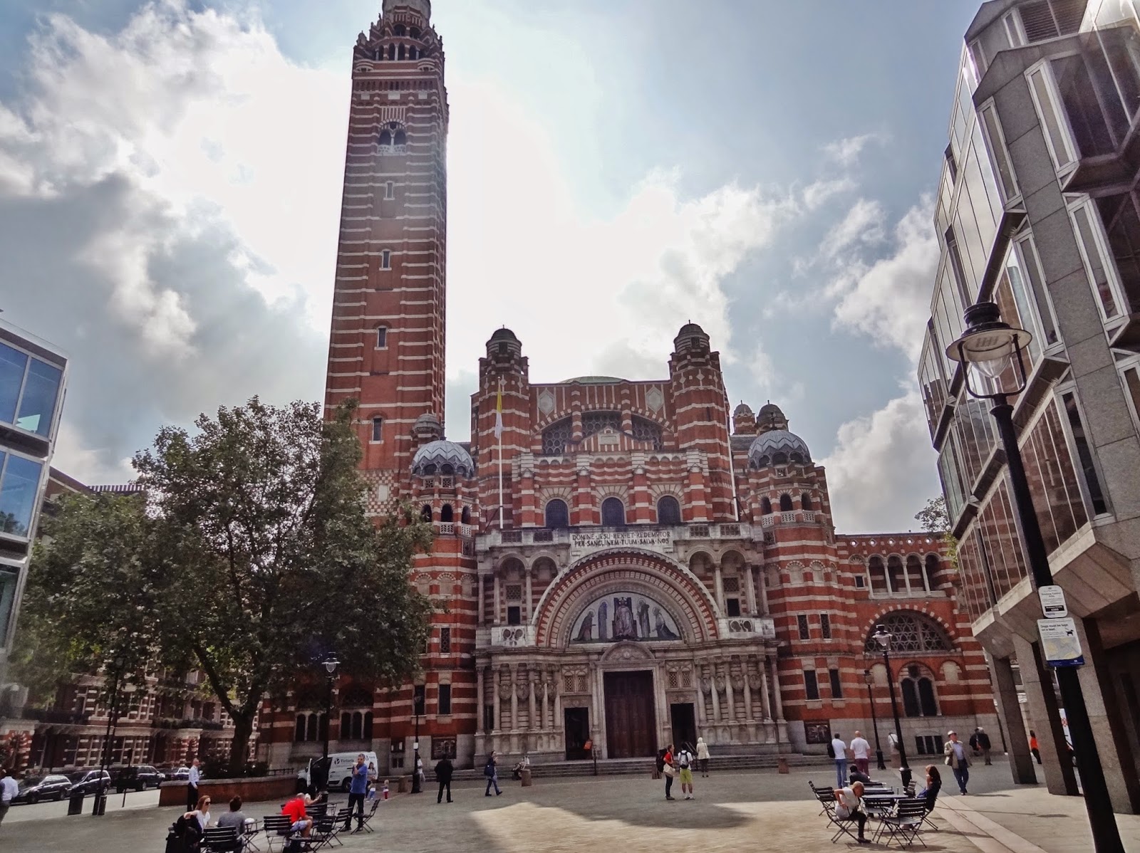 Nos gustó mucho, mucho, quizás por lo diferente, por su estilo bizantino. Exteriormente cúpulas, el campanario de San Eduardo de más de 83 metros de altura, ladrillo rojo y piedra de Portland son sus señas de identidad más destacadas. Y el interior, espectacular con más de cien tipos diferentes de mármoles, que conforman la decoración y espectaculares columnas talladas. Cuenta con once capillas cubiertas por bonitos mosaicos bizantinos, así como las bóvedas del santuario. La bóveda central aún se encuentra sin decorar.