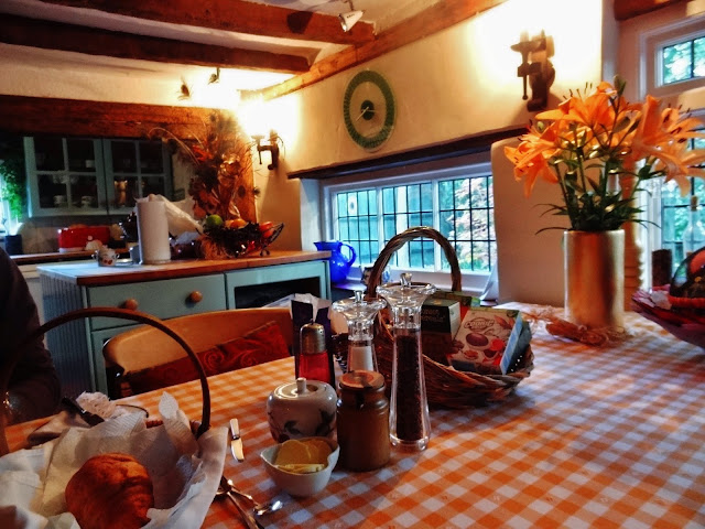 Por la mañana desayunamos en la bonita cocina de la casa, espacio de techos muy bajos y aspecto rustico country. Desayuno inglés completo con huevos, bacón, salchichas y tomate. Además de café con leche yogures, croissants, tostadas, etc.