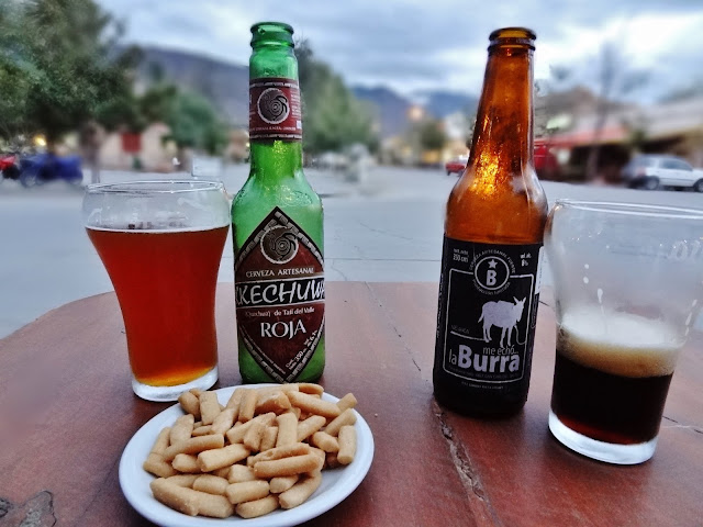Nos relajamos en un terraza de uno de los muchos bares y restaurantes que hay en la plaza principal con dos artesanales cervezas, una negra llamada Me Echó La Burra de la población cercana de San Carlos y otra tostada de Tafi del Valle.