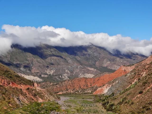 El descenso por la Cuesta del Obispo en pleno Valle Encantado, las sugerentes formas de la montaña, invadida por verde vegetación, nubes, cardones y una tierra de color rojizo, convierten a este lugar en magia.