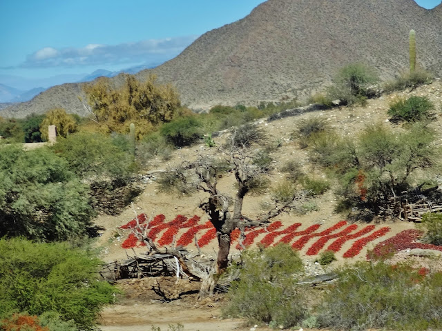 En el trayecto, seguimos encontrando bellos paisajes, que acercándonos a la población de Cachi, comenzaron a ser salpicados por el color rojizo proveniente de numerosos secaderos al aire libre de pimiento rojo, con el que una vez seco se elabora el conocido en Argentina, Pimentón de Cachi.