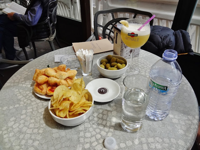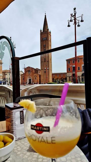 De vuelta a la Piazza Saffi decidimos tomar un tentempié en una de sus terrazas. Una botella de agua y un vino prosseco con crema de plátano. Un pelín cara la cuenta, pero al menos nos acompañaron las bebidas con un plato de patatas, otro de aceitunas grandes y un tercer plato con masas de hojaldre rellenas. Eso y las excelentes vistas compensaron de manera suficiente el elevado precio de las viandas.