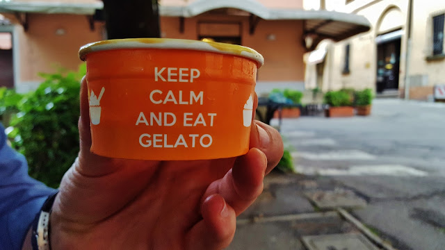Encantados con Brisighella decidimos hacer una paradita para degustar un buenísimo helado y hacer honor aunque solo fuera por un momento, al mensaje de la tarrina en la que nos pusieron el helado.