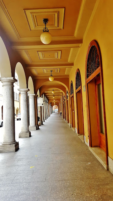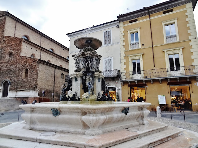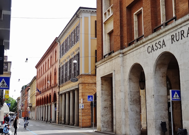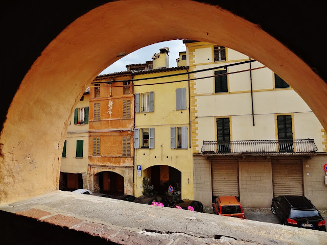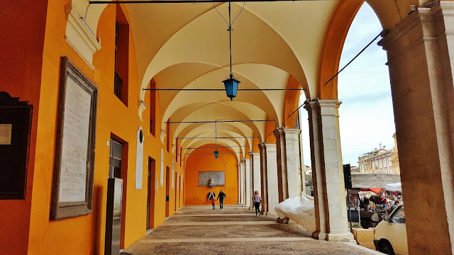 Uno de estos lugares a visitar la Piazza Aurelio Staffi. Dejamos el coche estacionado en la calle Flavio Biondo cercana de la Calle Corso della Repúbblica, para llegar caminando sobre esta calle que culmina en la mencionada Piazza. En esta calle nos encontramos con un elemento constructivo que va a predominar en muchas de las ciudades y pueblos de la región, amplios y decorados soportales por los que caminar protegidos de las inclemencias climatológicas.