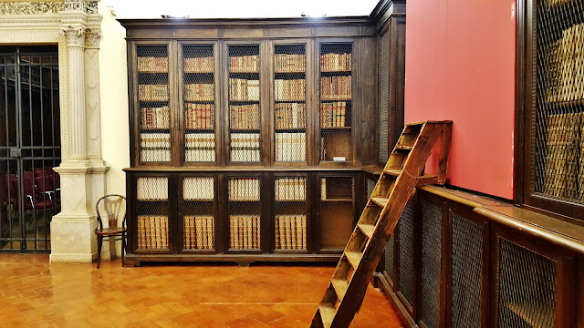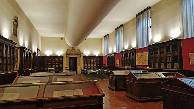 Hicimos una visita a esta joya, acompañados por el guía que aún explicándose en italiano conseguimos entender la mayoría de sus explicaciones acerca de la biblioteca. La visita guiada nos costó cinco euros y en primer lugar se pisa la antigua biblioteca siendo esta parte la que es ciertamente admirable, para después pasar a la llamada Biblioteca Antica en la que se conservan más de 250.000 volúmenes de ellos 287 incunables.