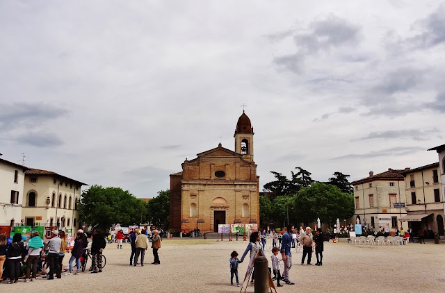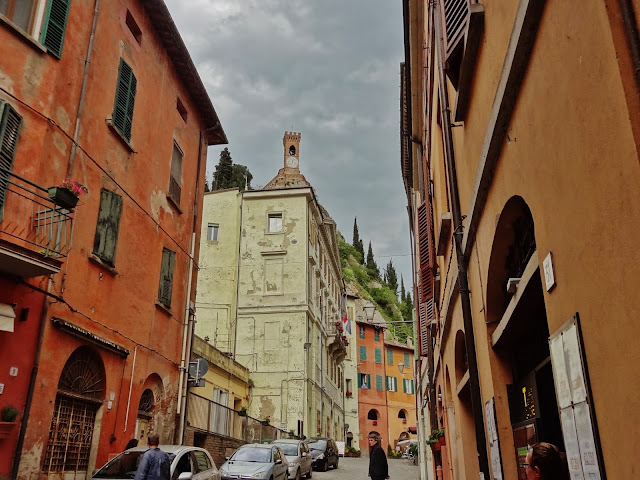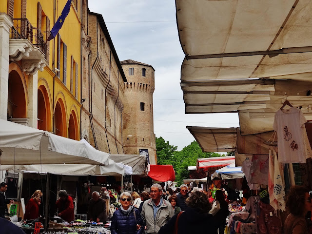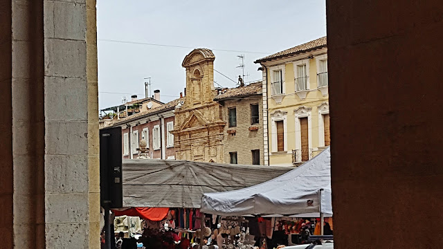 Llegamos a la ciudad en el día en el que se celebraba en la Piazza del Popolo un mercadillo, que a pesar de dar mucha vida a la ciudad, la aglomeración de puestos, furgonetas y demás avíos propios de estos mercadillos, ocultaban los edificios, casas y antiguas construcciones no permitiéndonos tener una visión limpia de la plaza.