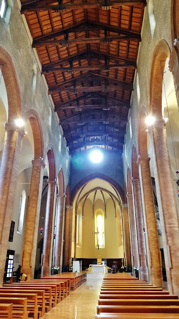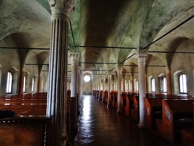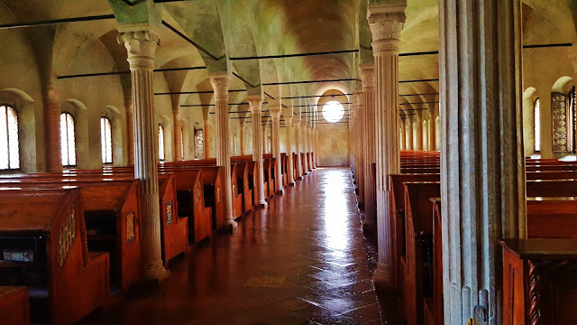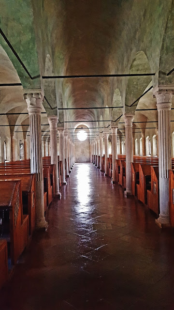 Por último y como atractivo más importante de Cesena, en nuestra modesta opinión, la Biblioteca Malatestiana del año 1482 y que fue la primera biblioteca pública de Europa, respetando y conservando en la actualidad el aspecto y mobiliario original. Nos fascinó.