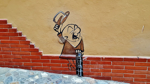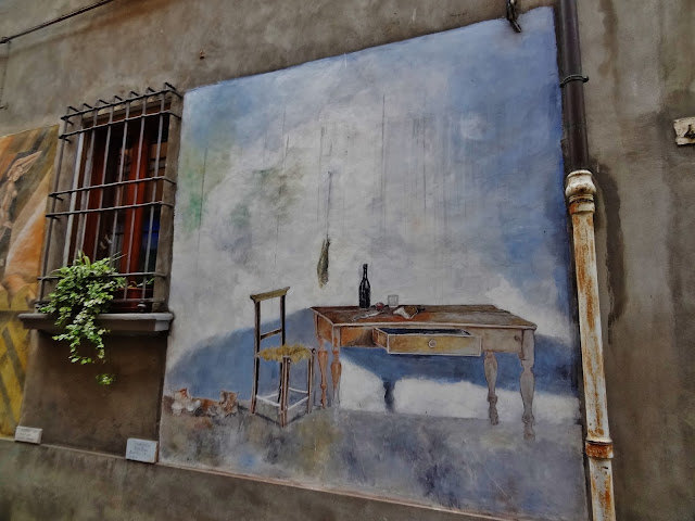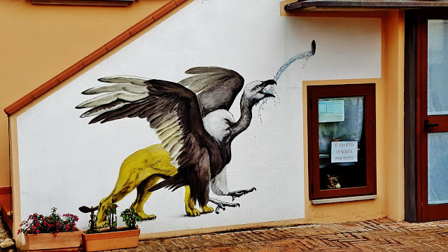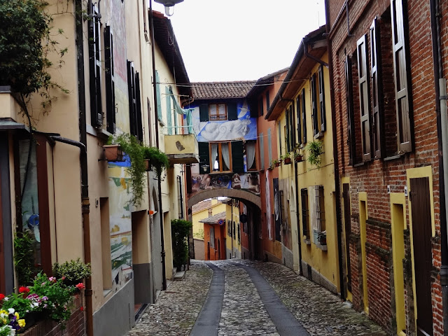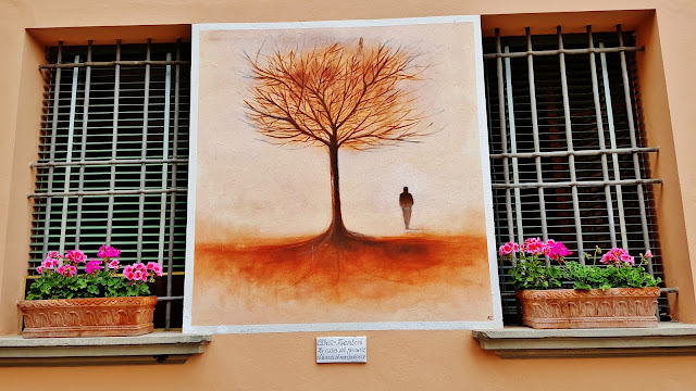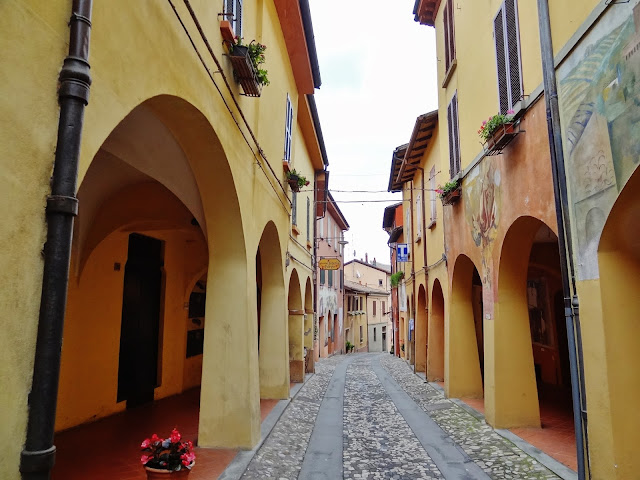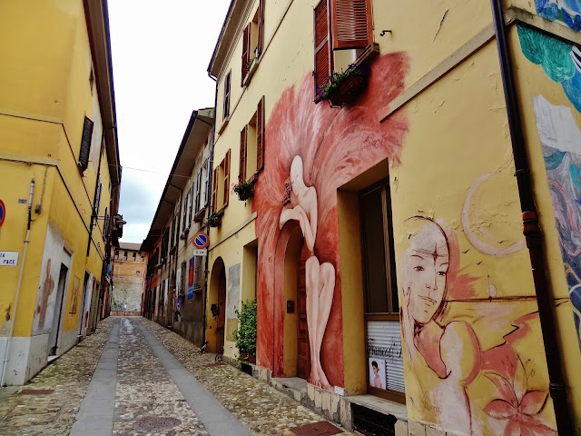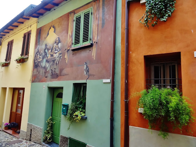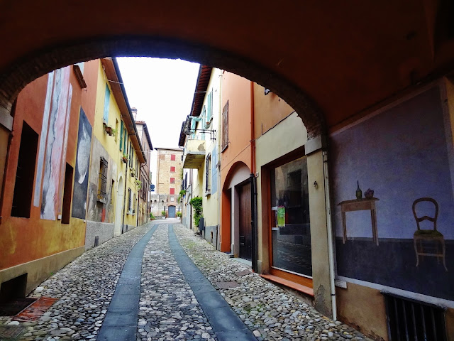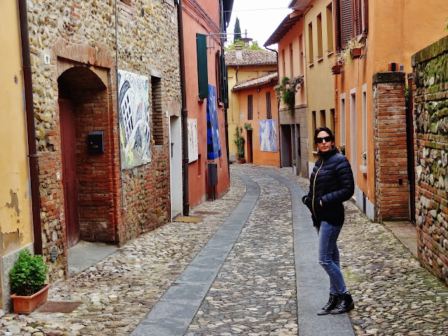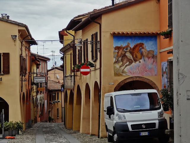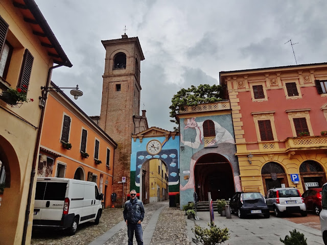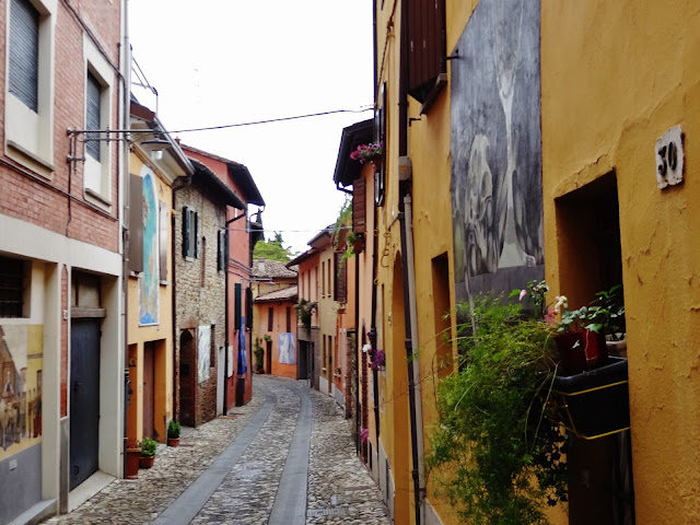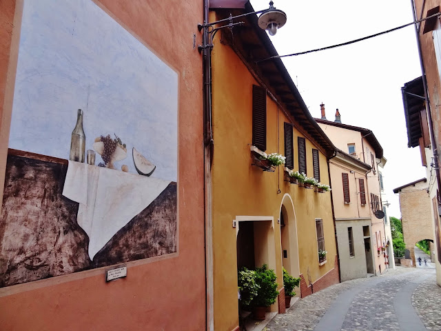 Dos calles principales que nosotros utilizamos para subir la una hasta la parte más elevada en la que se sitúa su castillo o Rocca y la otra para bajar. Además del encanto propio del pueblo debido a su situación, a su distribución, a sus calles, edificios y casas, Dozza reúne una característica adicional que le otorga un si cabe, mayor interés turístico. Un gran número de sus casas tiene pintadas sus fachadas con dibujos y pinturas, algunas de ellas auténticas obras de arte.