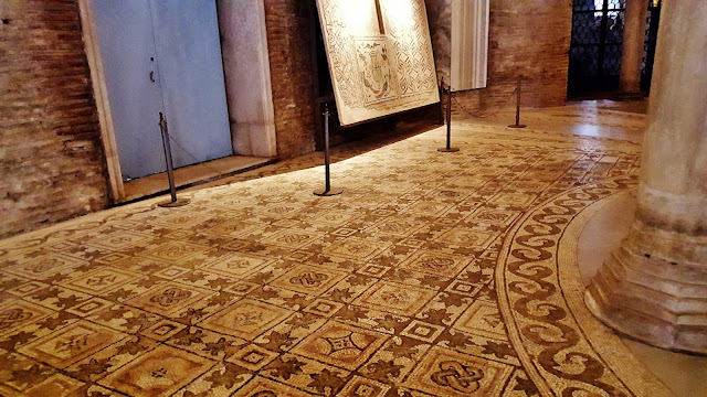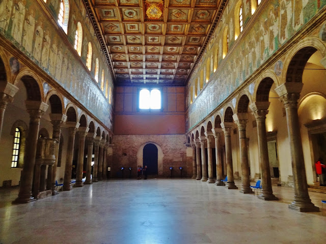 El interior es similar al resto de iglesias que vimos durante el día, con una estructura de de tres naves separadas entre sí por hileras de arcos. Los mosaicos que decoraban los muros y paredes desparecieron en el siglo XVII, consiguiendo con este hecho el que la iglesia no tenga el brillo y esplendor que si tienen otros monumentos de la ciudad. En el momento que hicimos la visita los únicos restos de mosaicos que pudimos observar correspondieron a una exposición de restos de mosaicos de suelo, que colgaban en las paredes laterales de la iglesia.