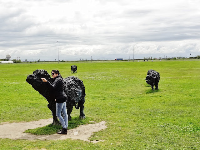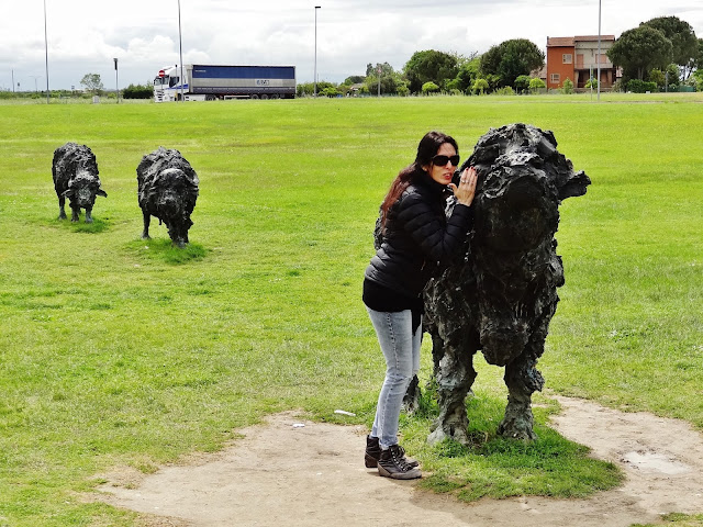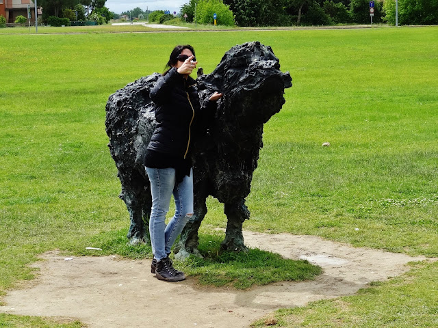 En la pradera verde que rodea la Basílica hay varias esculturas en bronce de unos búfalos que parecen aproximarse a la iglesia. He intentado buscar en internet el significado de estas esculturas pero no he encontrado nada claro y por lo leído e interpretado hay mucha polémica en la zona por el significado, por el coste, por no tener nada que ver con la iglesia, etc, etc.