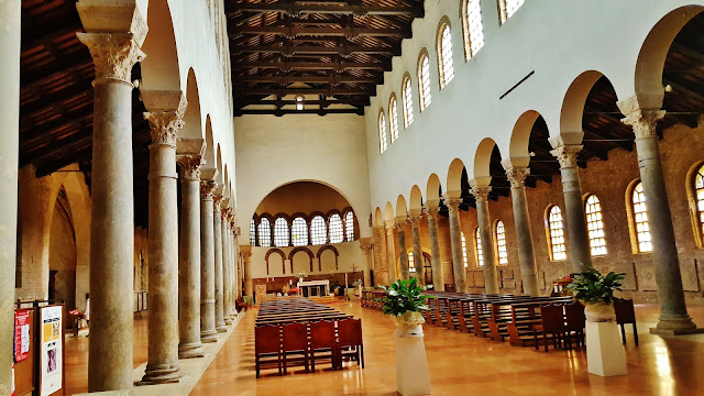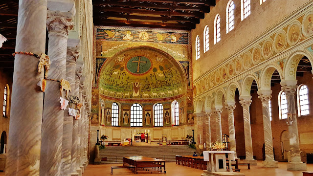 El ábside también se encuentra decorado con mosaicos. Según la Unesco esta basílica es un destacado ejemplo del arte paleocristiano por su pureza, simplicidad de diseño y uso del espacio.