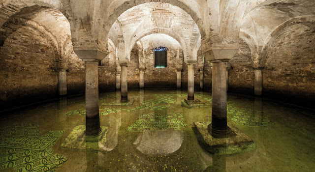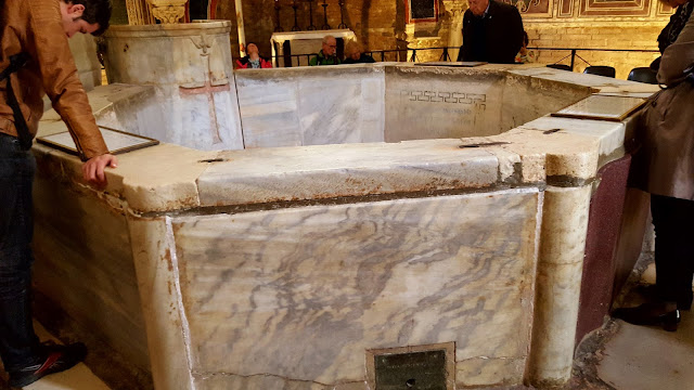 El suelo de la cripta está decorado con mosaicos y con especial característica de estar cubierta por uno palmos de agua, de forma continuada. En esta especie de piscina hay incluso peces que parece generan un muy sugerente efecto.