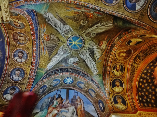 Sí el exterior es muy bello, cuando se accede al interior de la Basílica, la sorpresa es máxima. Nosotros al menos no estamos acostumbrados a tan sublime combinación de armonía y belleza conseguida por la misma estructura de la iglesia con su gran cúpula central profusamente decorada, por sus suelos repletos de mosaicos y por los mismos mosaicos coloridos de sus paredes, repletos de toda la iconografía imaginable para la época.