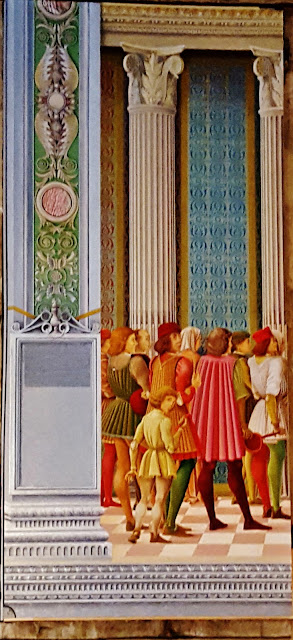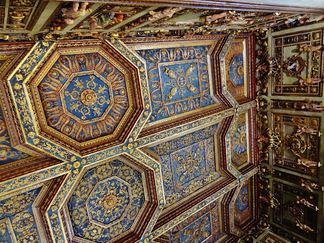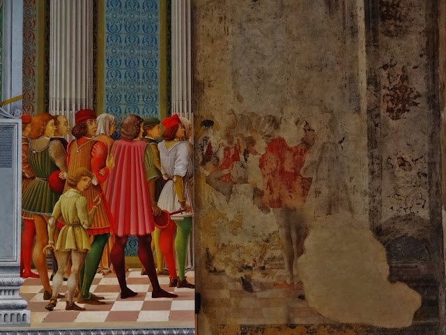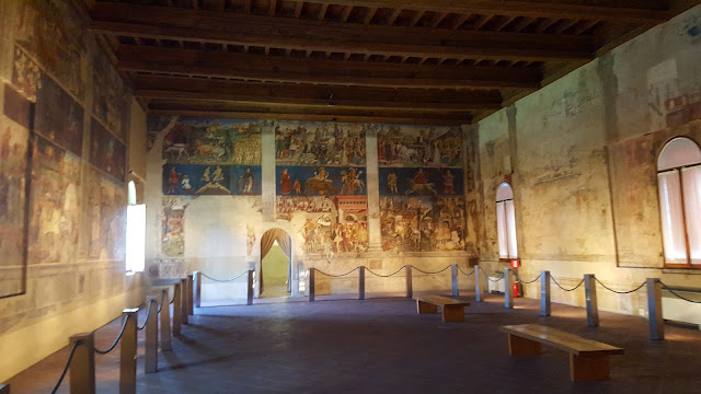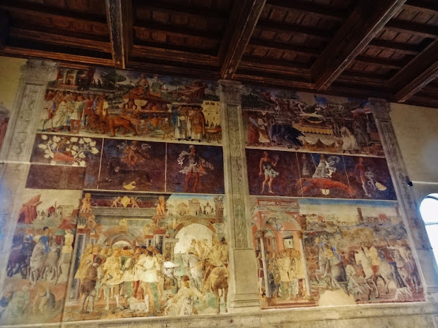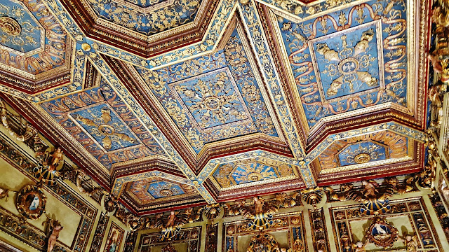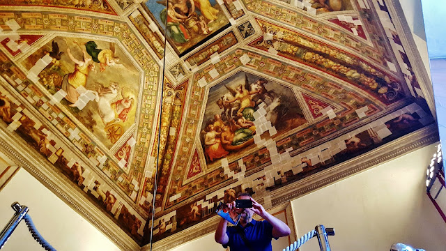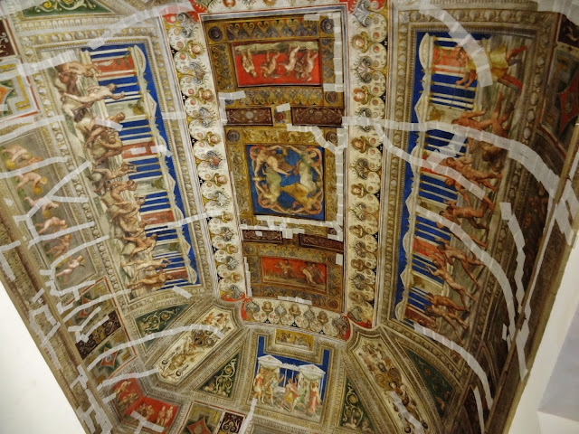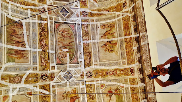 En el momento que realizamos esta visita muchas de las bóvedas y techos se encontraban dañados con numerosas grietas producidas por los recientes terremotos producidos en Italia. Para minorar los efectos de las los agrietamientos los técnicos debieron considerar suficiente el taparlas con cinta y produciendo un triste efecto a los ojos de los visitantes, aunque entiendo que imprescindible para garantizar la conservación de los techos pintados.