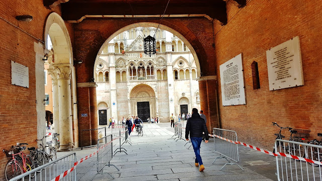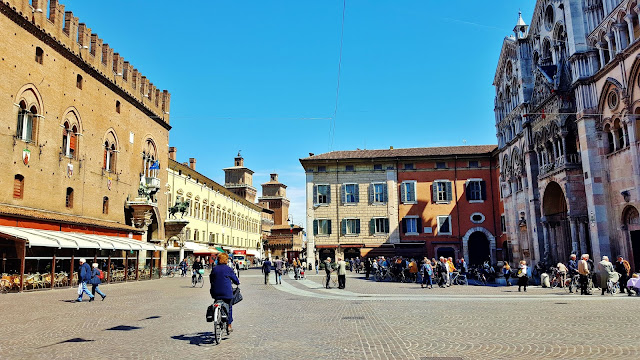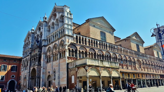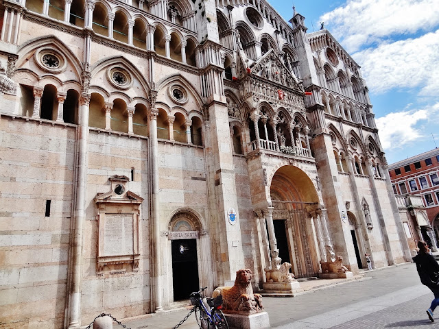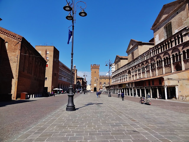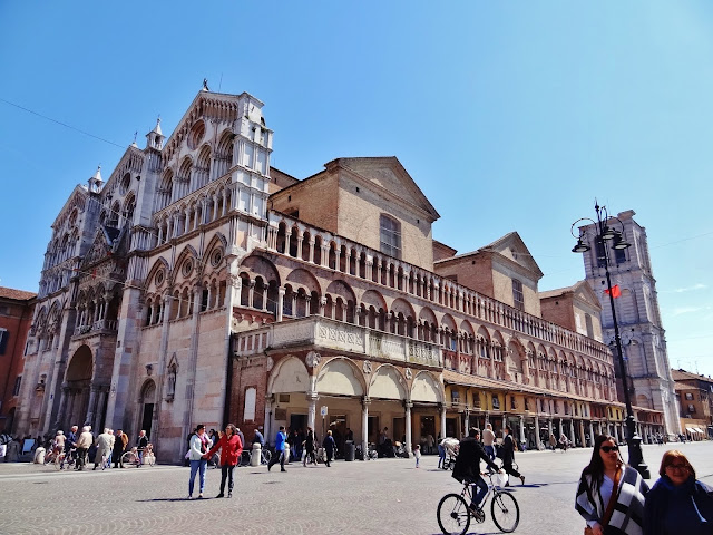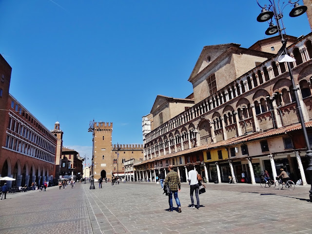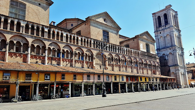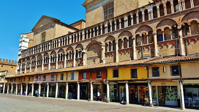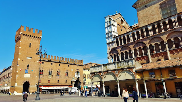 Lo cierto es que desde la Piazza Savonarola se concatena una sucesión de piazzas, porque antes de llegar a la Piazza de Trento y Trieste se pasa antes por la Piazza della Catedrale, en la que se enfrentan las fachadas de dos de los edificios más importantes de la ciudad como son la Catedral de San Jorge y el Palazzo Ducale.