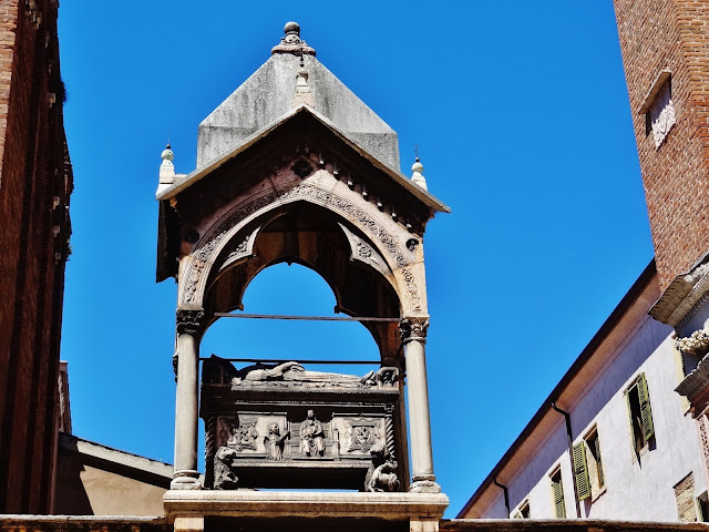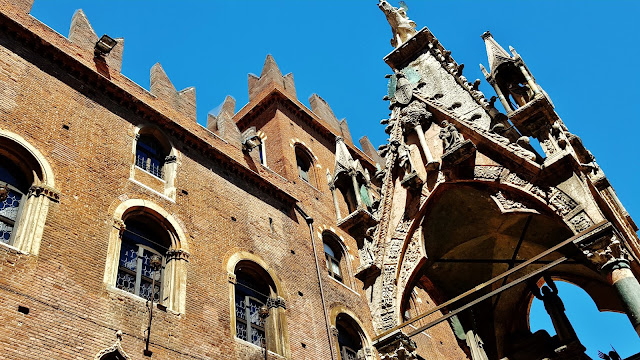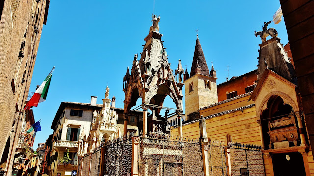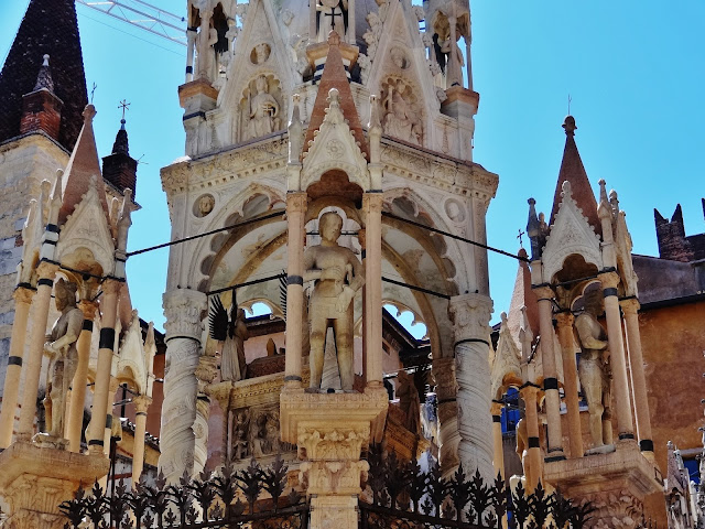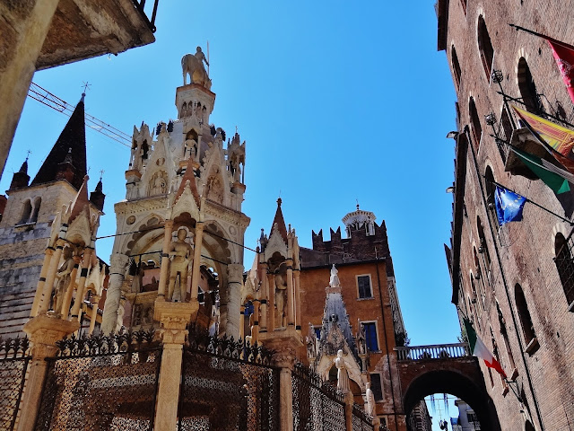 En una de las salidas de la Piazza se encuentra la Iglesia Santa María Antica que no pudimos visitar por estar cerrada, pero si disfrutar del monumento ARCAS SCALIGIERE, espectaculares tumbas monumentales goticas de la familia Scaligieri.
