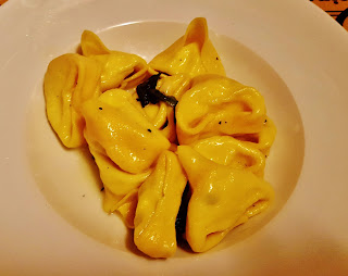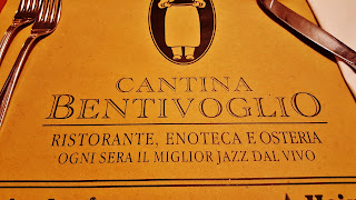 Comimos como entrante o antipasti una tradicional mortadela , acompañada de una exquisita espuma de mortadella y tigellini ( panecillos tostados). De segundo Tortelloni de ricota, burro (mantequilla) y salvia que resultaron deliciosos y unos Taglioline al Prosciuto e Limone, que con el toque de la cascara de limón rallada fueron muy sutiles y exquisitos. Y de postre una Crema Cotta a la vainilla con caramelo al vino marsala. Todo ello regado con un vino frizzante llamado Pignoleto la Mancina, que nos aconsejaron y por el que pagamos 16 euros la botella.