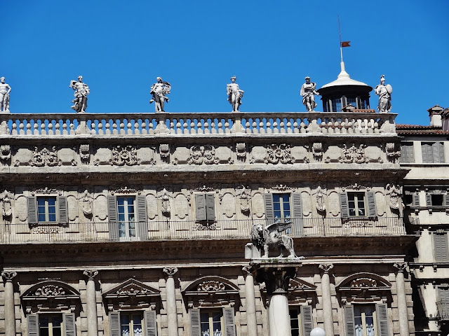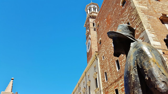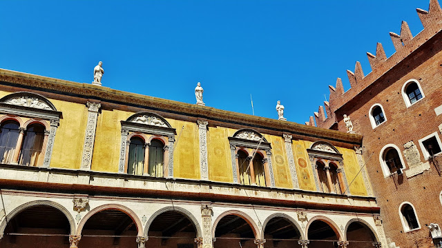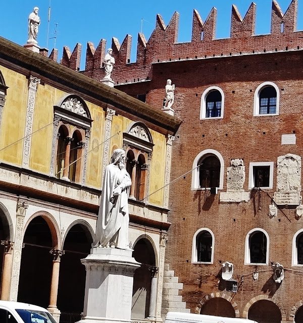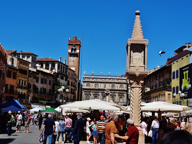En el lado opuesto la Casa dei Mercanti, la Torre Gardello y varias bonitas casas. Y en el fondo de la Piazza el Palazzo Maffei, de estilo barroco y coronado con estatuas de dioses griegos.