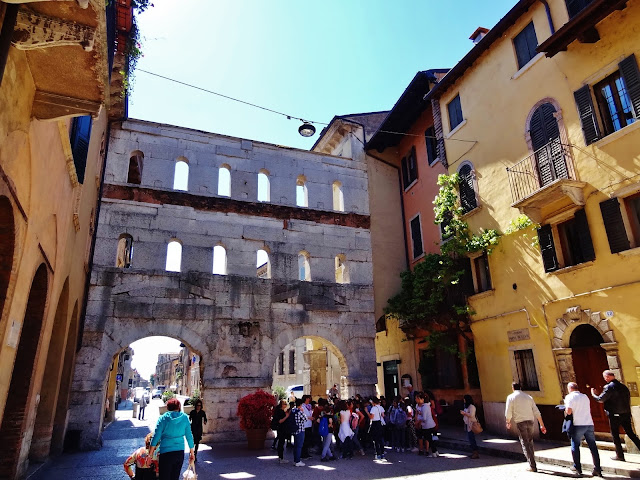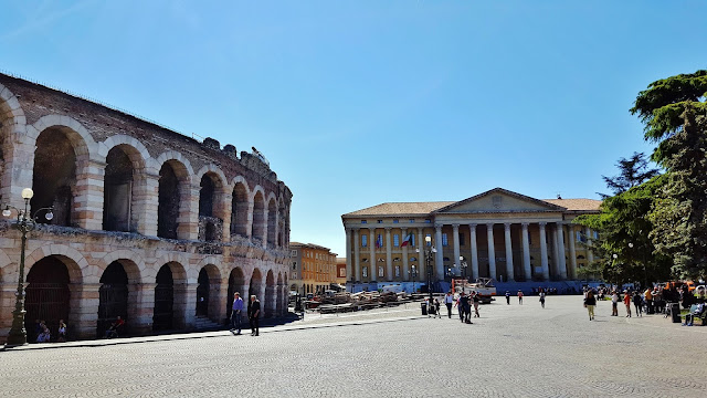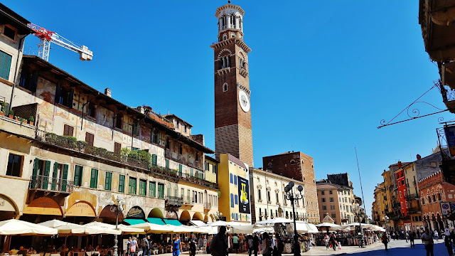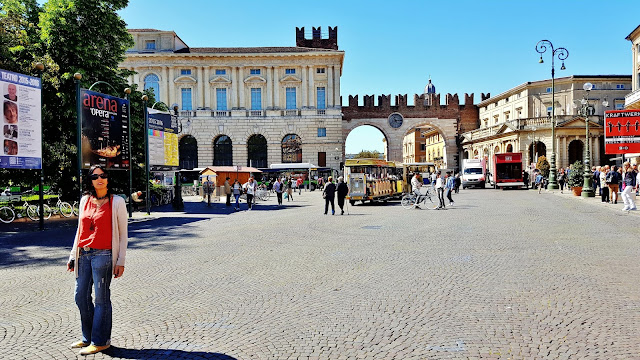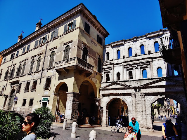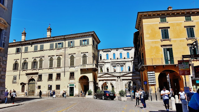 Desde el Museo Lapidario accedemos a la Piazza Bra atravesando dos grandes arcos del siglo XIV, coronados por un reloj del siglo XIX.