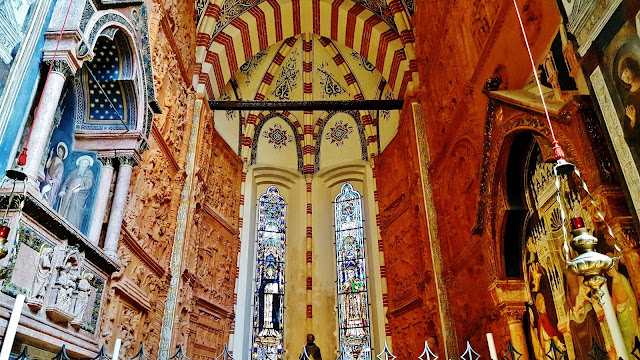 El interior de la iglesia se divide en tres naves separadas por estilizadas columnas de mármol rojo y blanco.
