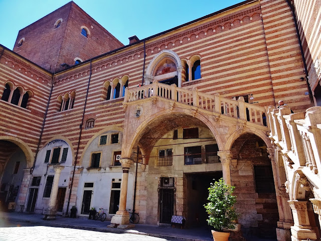 Ya en el patio se observa la bella casa de ladrillo rojizo que fue construida en el siglo XII por la familia llamada Capeli tal y como se desprende de una insignia que debe hay en la fachada. La leyenda popular atribuye a la familia Capuleti.