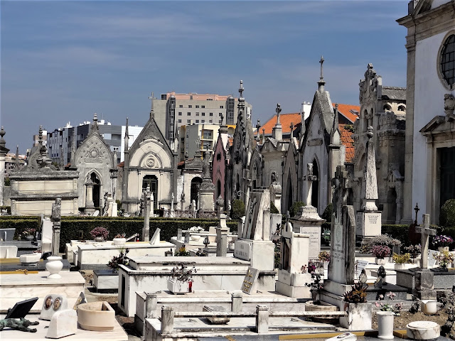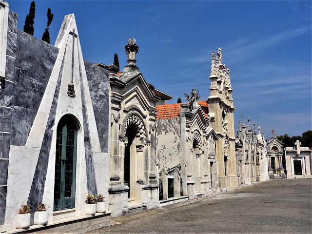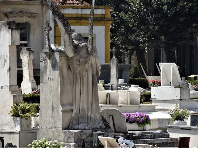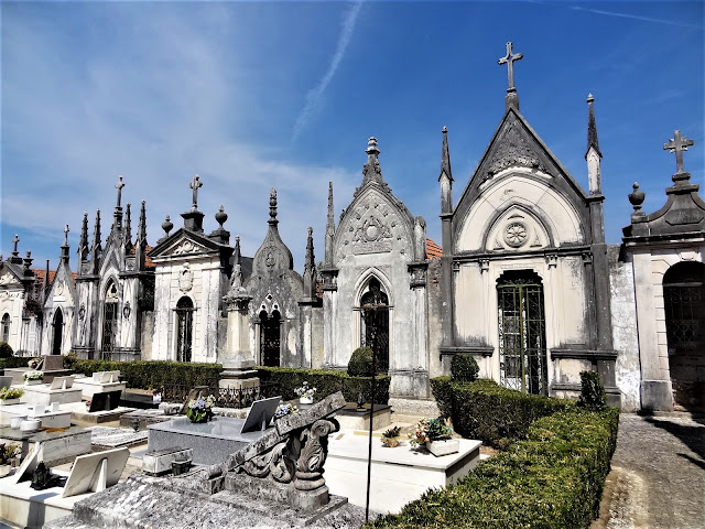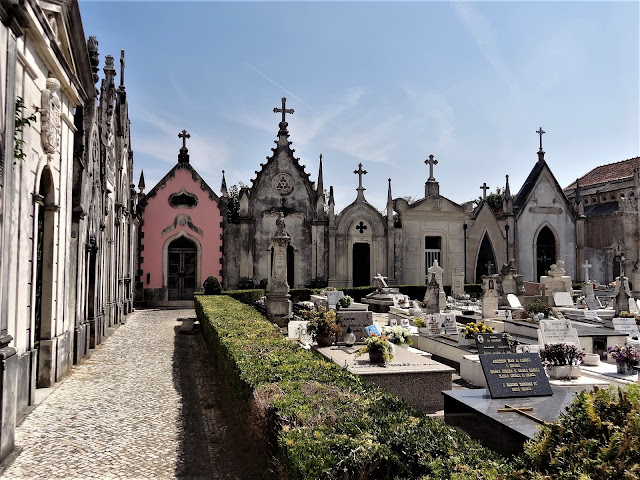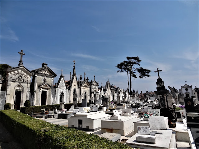 Muy cerca del parking de este centro comercial se encuentra el Cementerio Municipal de Aveiro que nos llamó la atención tanto como para que dejáramos caer nuestros pasos por el interior del mismo. Como suele ocurrir con algunos otros cementerios del mundo, las obras de arte y los panteones monumentales del cementerio de Aveiro, dan pie a que el turista pueda fijar como uno de los objetivos del viaje este recinto.