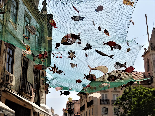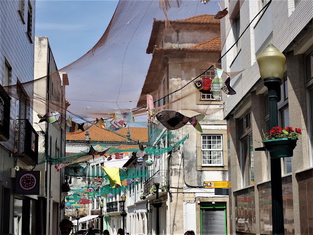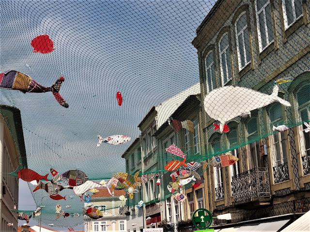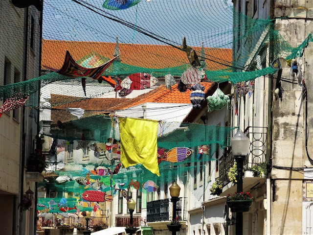 En el entorno de esta plaza colgados entre las fachadas de las calles redes de pescadores con peces y todo tipo de pescados tejidos con lana y parece que en estilo crochet, que daban un aspecto muy colorido y divertido a la zona.