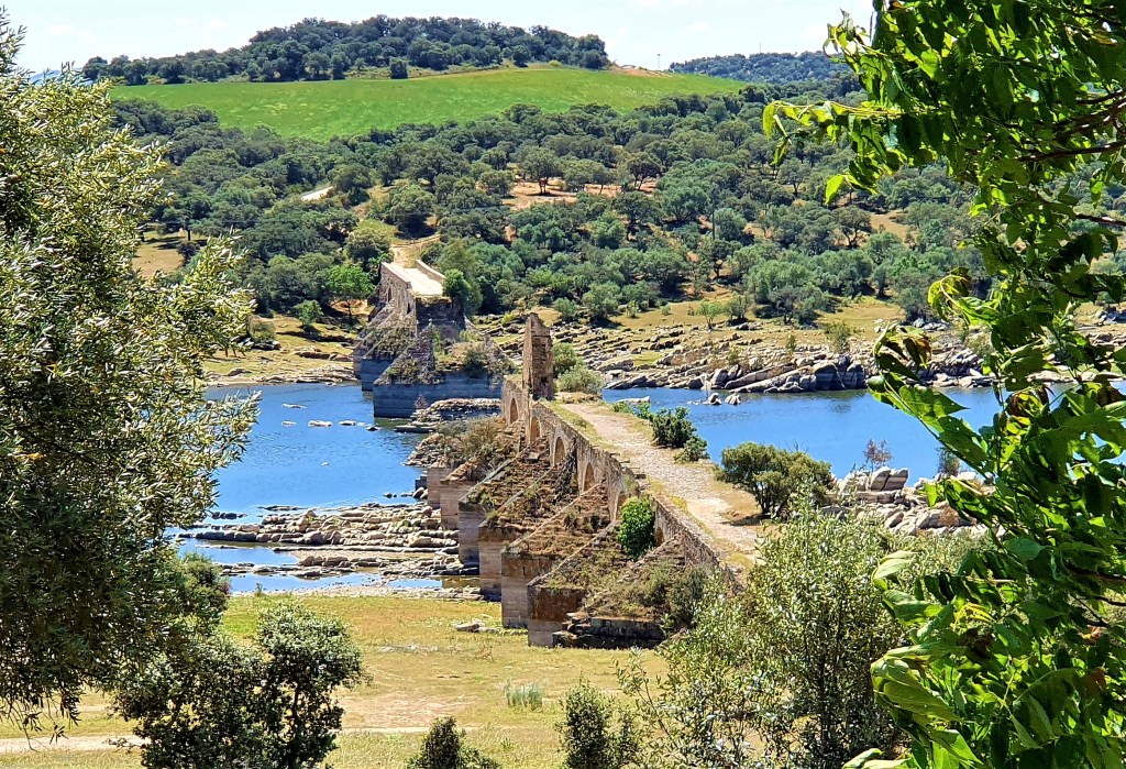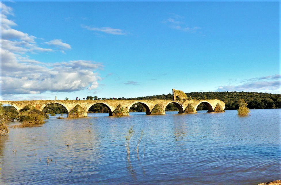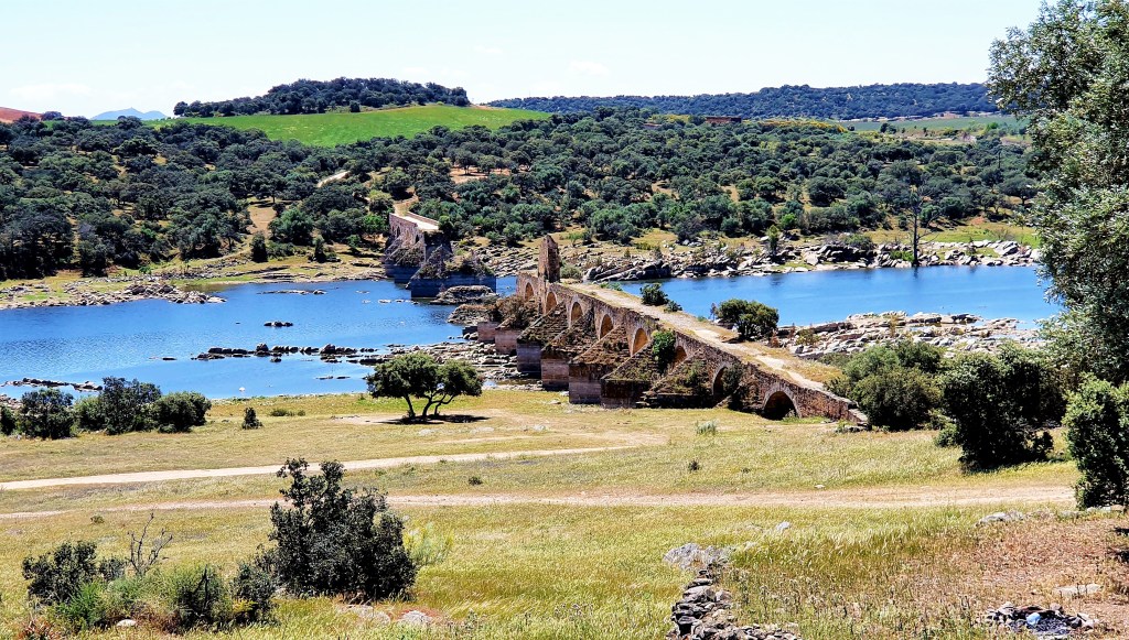 Tiene 380 metros de longitud sobre el río Guadiana, construido con granito y con 19 arcos de los que hoy en día faltan los centrales.