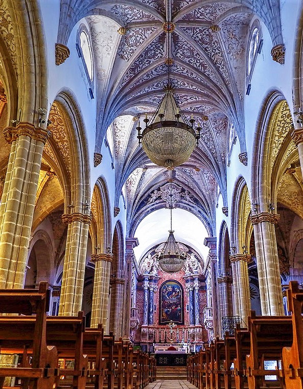 La catedral fortificada con almenas y una torre de 41 metros de altura, fue construida sobre una antigua iglesia visigoda y posteriormente mozárabe, entre los siglos XIII y XVIII. En el interior, que nosotros no pudimos visitar al estar cerrada, destaca su claustro gótico del siglo XVI.