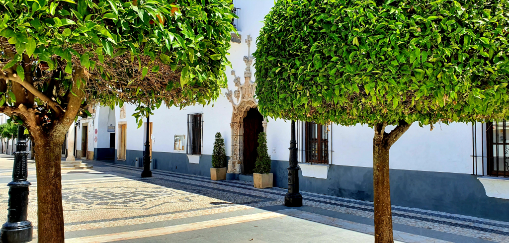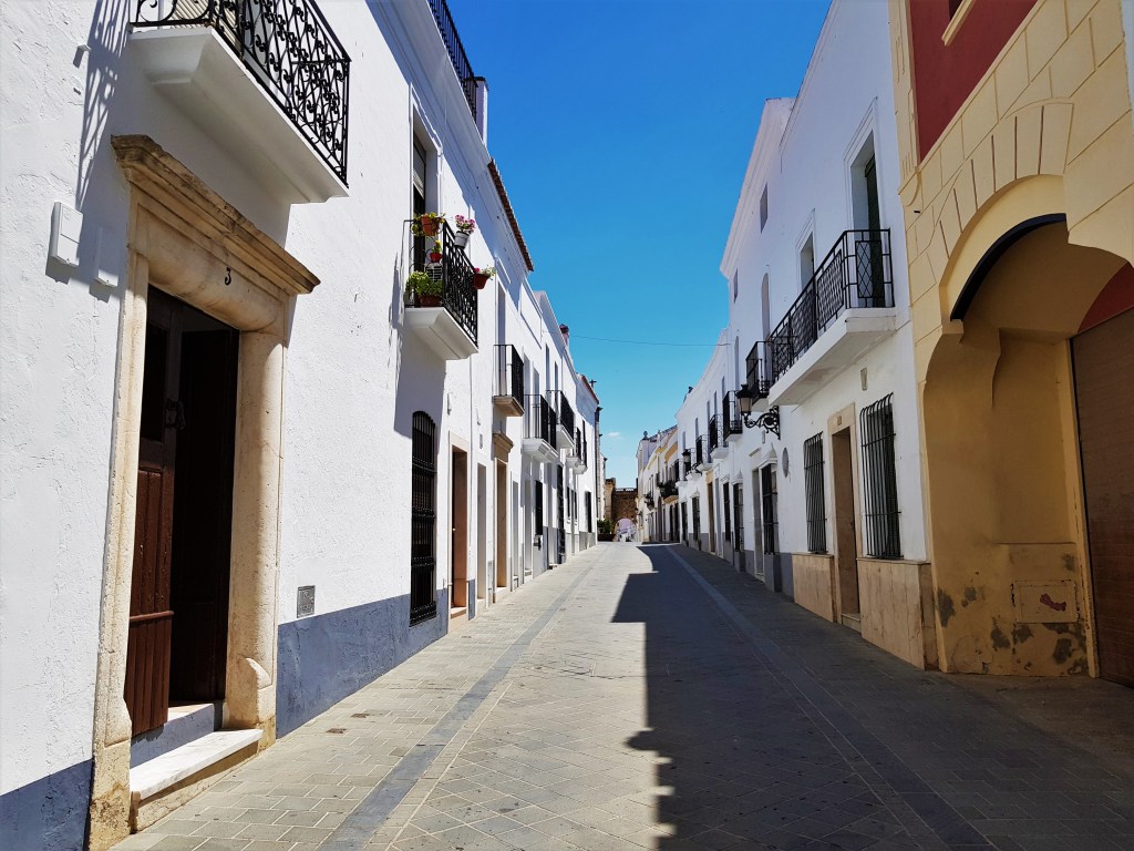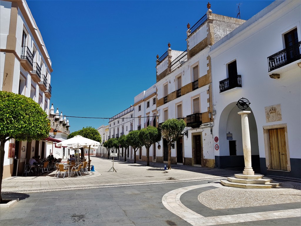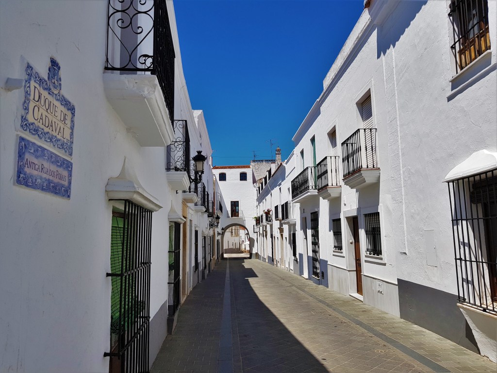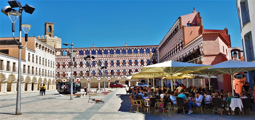 La calle de Caridad llama también la atención por empedrado típico portugués de piedras blancas y negras. Esta muy cercana a Plaza de la Constitución y Ayuntamiento, lugar donde decidimos poner fin al recorrido por Olivenza, tomando unas cañitas y viandas locales en una de las terrazas de la zona.
