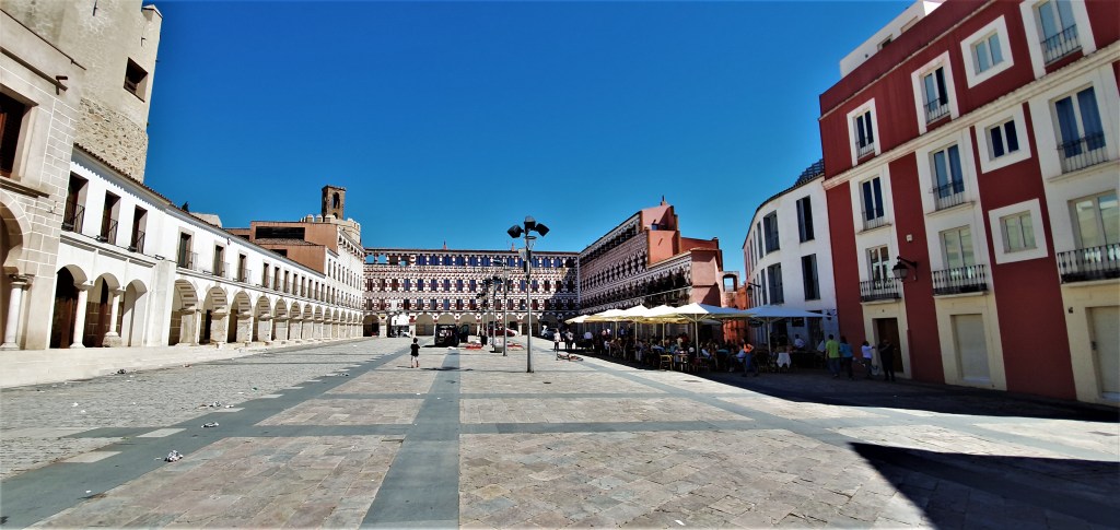 Desde la Puerta de Alconchel continuamos hasta llegar a Plaza de España también llamada Paseo Grande en contraposición a la inmediata Avenida de Portugal que se llama Paseo Chico.