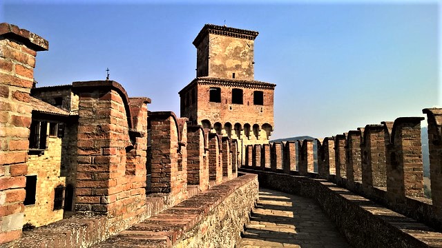 En realidad se trata prácticamente de un pueblo castillo , rodeado por grandes murallas y torreones, que pueden ser recorridas por los visitantes, en un paso de ronda que deja unas vistas inmejorables de todo lo que rodea a Vigoleno