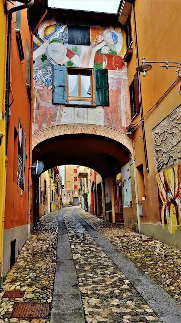 Un casco antiguo muy destacado, en el que Iglesias , Palazzos, casas señoriales, casas humildes y lugares tan pintorescos como la Via degli Asini , confluyen para dotar de un aspecto muy especial y pintoresco a este pueblo. Via degli Asini es una calle muy especial porque es cubierta , aparentando unos soportales , pero en este caso se trata de unos soportales , no al estilo clásico a pie y ras de calle . Subiendo unas escaleras desde una de las calles principales de Brisighella se accede a Via degli Asini. Pareciera en principio un acceso privado a un conjunto de viviendas pero al llegar sorprende esta calle elevada , empedrada y cubierta , con amplias ventanas arqueadas de diferentes tamaños que dan a esa calle principal desde la que se accede a Via degli Asini. Es algo único.