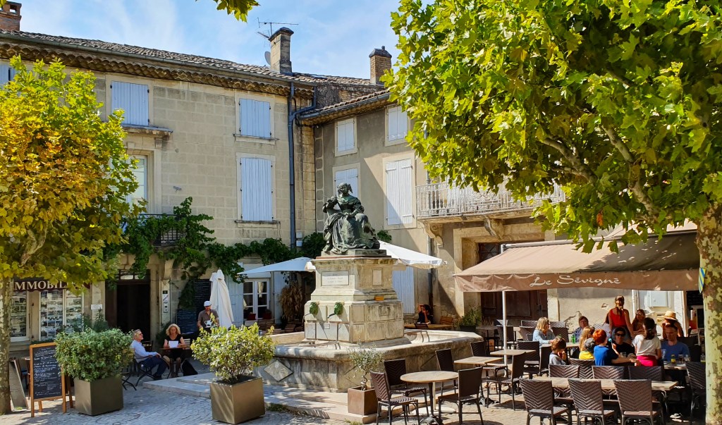 En la bella y antigua plaza del reloj encontraremos una fuente del año 1840 y a la que se le agregó en 1857 la estatua de la Marquesa Sévigné que fue el personaje más famoso del pueblo, residiendo en el castillo.